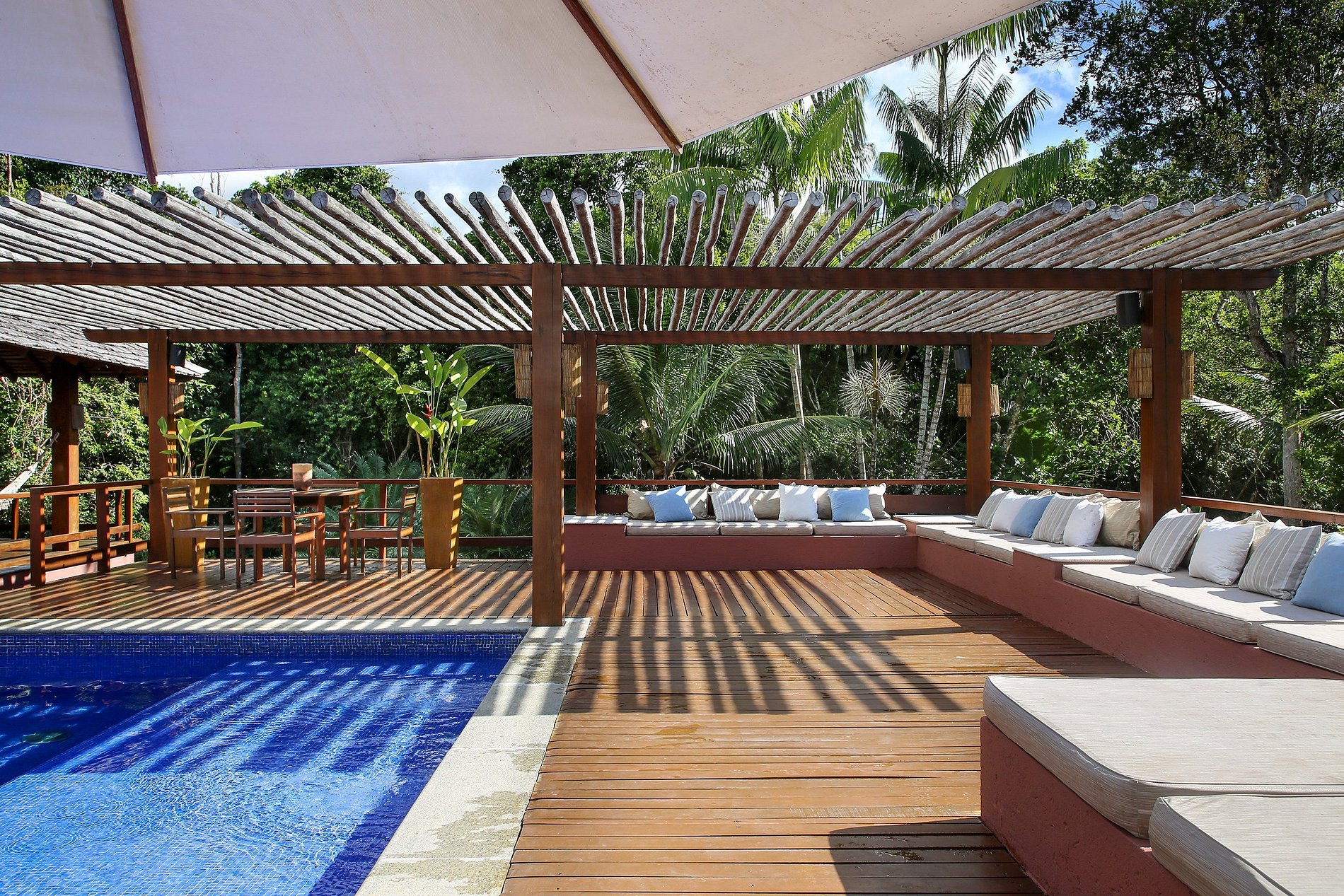 A área externa é um dos grandes destaques da propriedade: possui uma incrível piscina, churrasqueira e um lindo jardim, onde o canto dos pássaros da mata proporciona uma harmonia total durante as férias. Fica no Condomínio Villavista , onde se encontra um dos campos de golfe mais espetaculares da América Latina, o Terravista Golf.