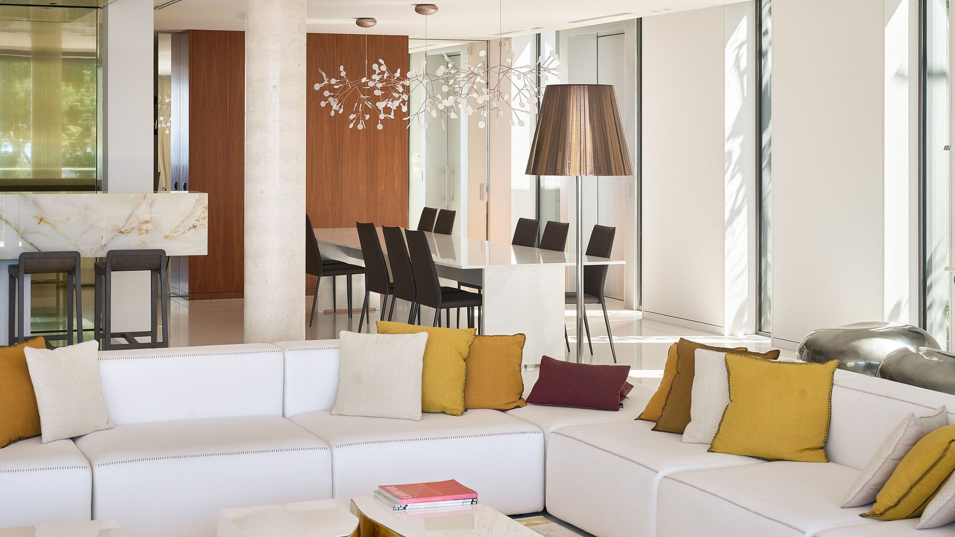 Ao entrar, os hóspedes são recebidos em uma ampla e iluminada sala de estar, perfeita para momentos de convivência, acompanhada de uma sala de jantar elegante e uma cozinha aberta com bar, ideal para encontros descontraídos.