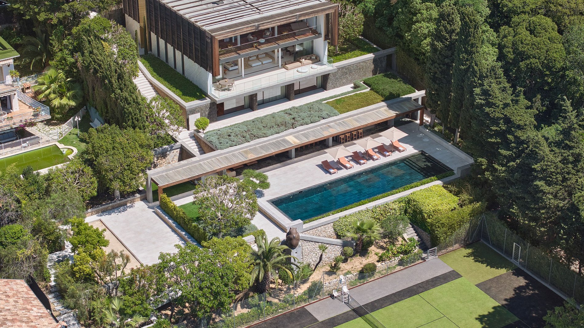 A área externa é igualmente impressionante, com uma grande piscina aquecida e um sofisticado pool house, convidando os hóspedes a relaxar sob o sol da Riviera Francesa. Para os amantes do esporte, um quadra de tênis sintética está rodeada por um exuberante jardim bem cuidado. A propriedade também conta com uma casa independente para funcionários, garantindo segurança e manutenção. Por fim, um amplo garagem acomoda confortavelmente dois a três veículos.