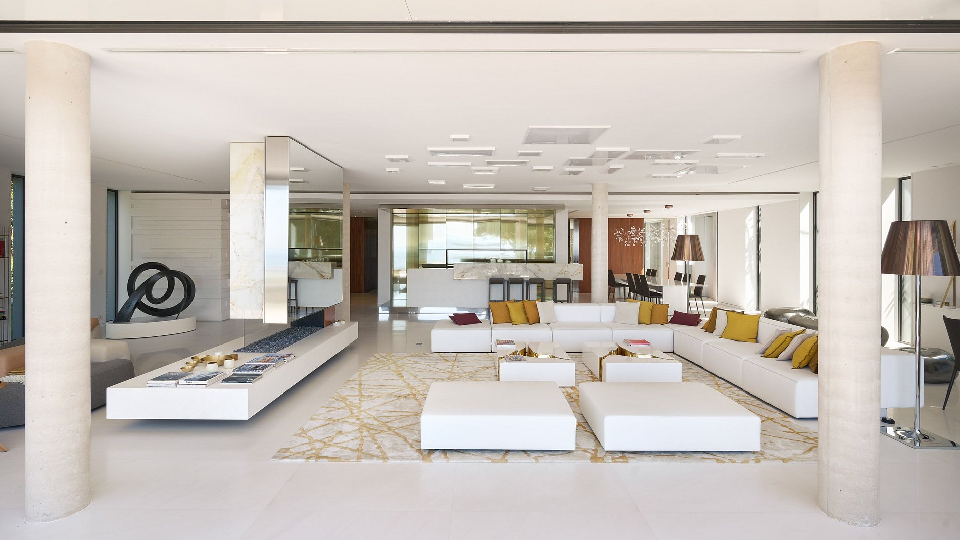 Ao entrar, os hóspedes são recebidos em uma ampla e iluminada sala de estar, perfeita para momentos de convivência, acompanhada de uma sala de jantar elegante e uma cozinha aberta com bar, ideal para encontros descontraídos.
