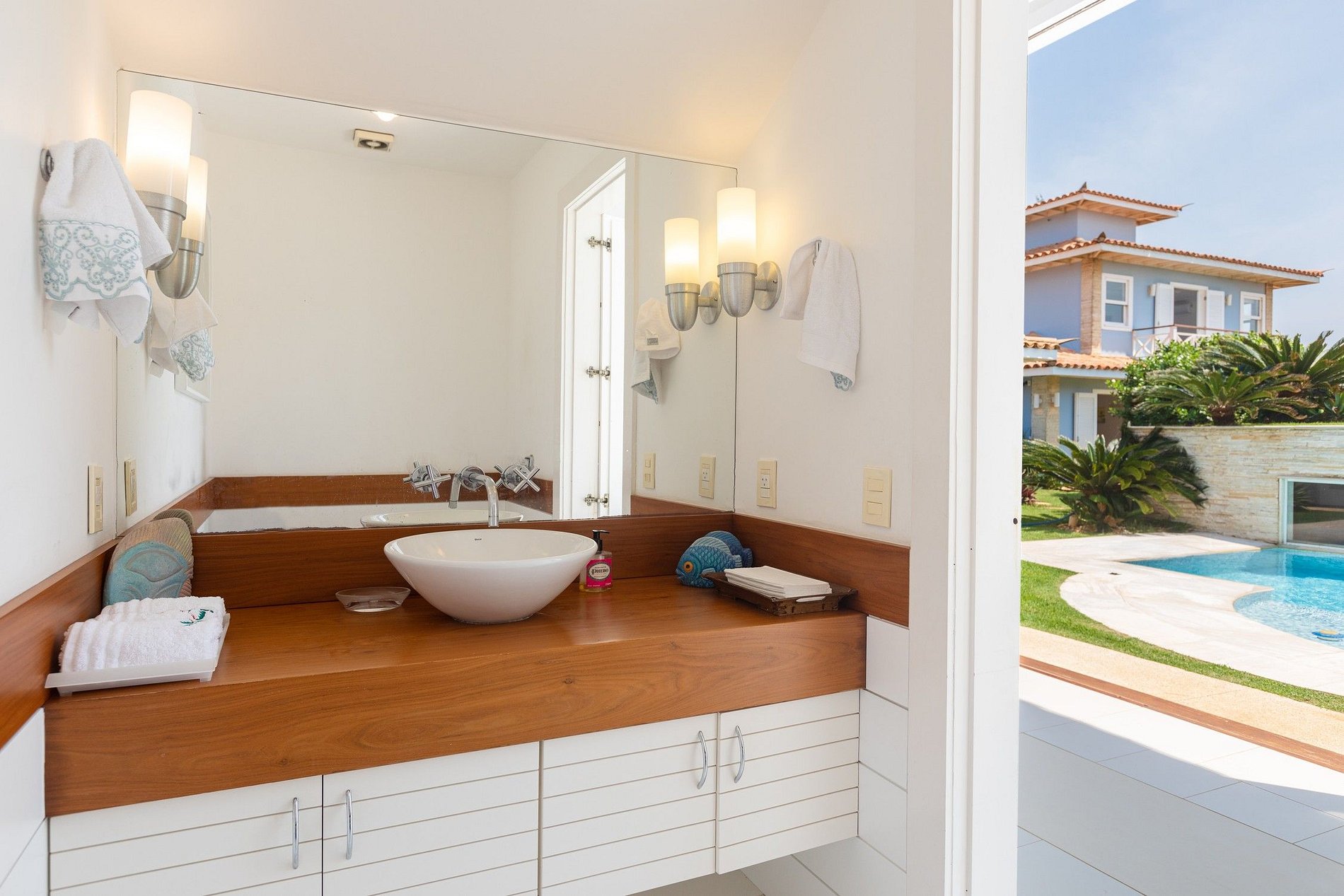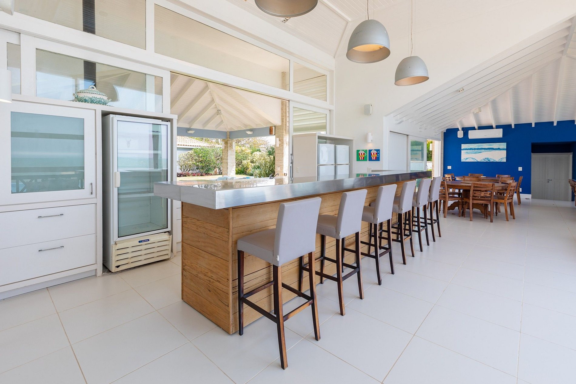 O estilo da casa combina o rústico com o moderno em uma harmonia tropical característica das luxuosas residências de Búzios. No salão de jogos, uma grande mesa de sinuca de madeira rústica garante lazer para todas as idades.