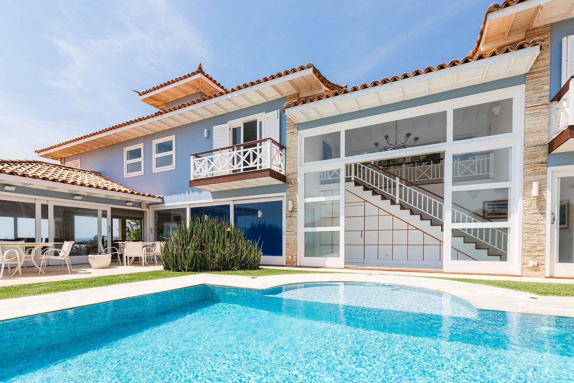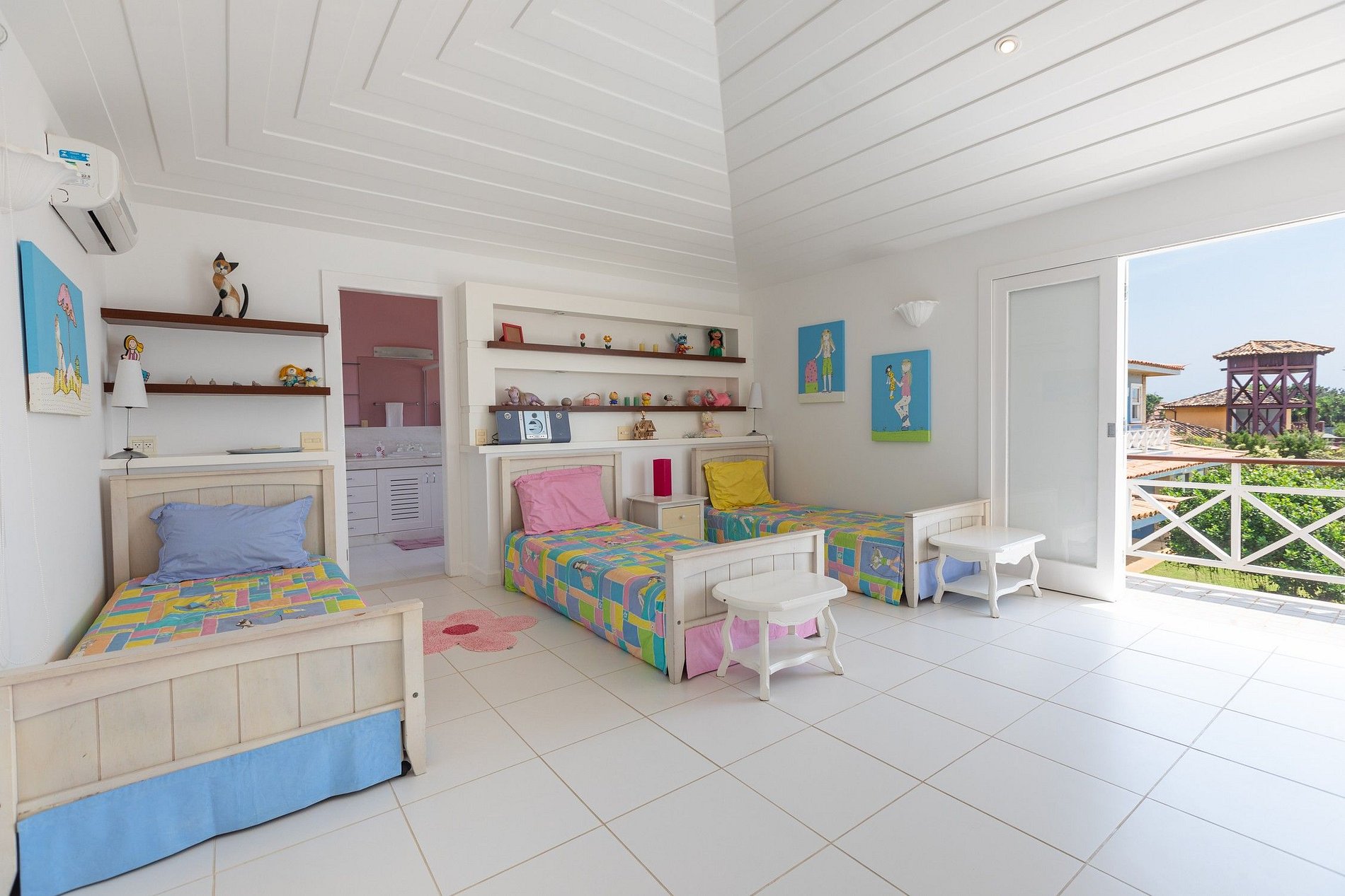 A propriedade possui dois andares com amplas janelas que deixam entrar luz natural e a brisa do mar, criando uma atmosfera arejada e acolhedora.