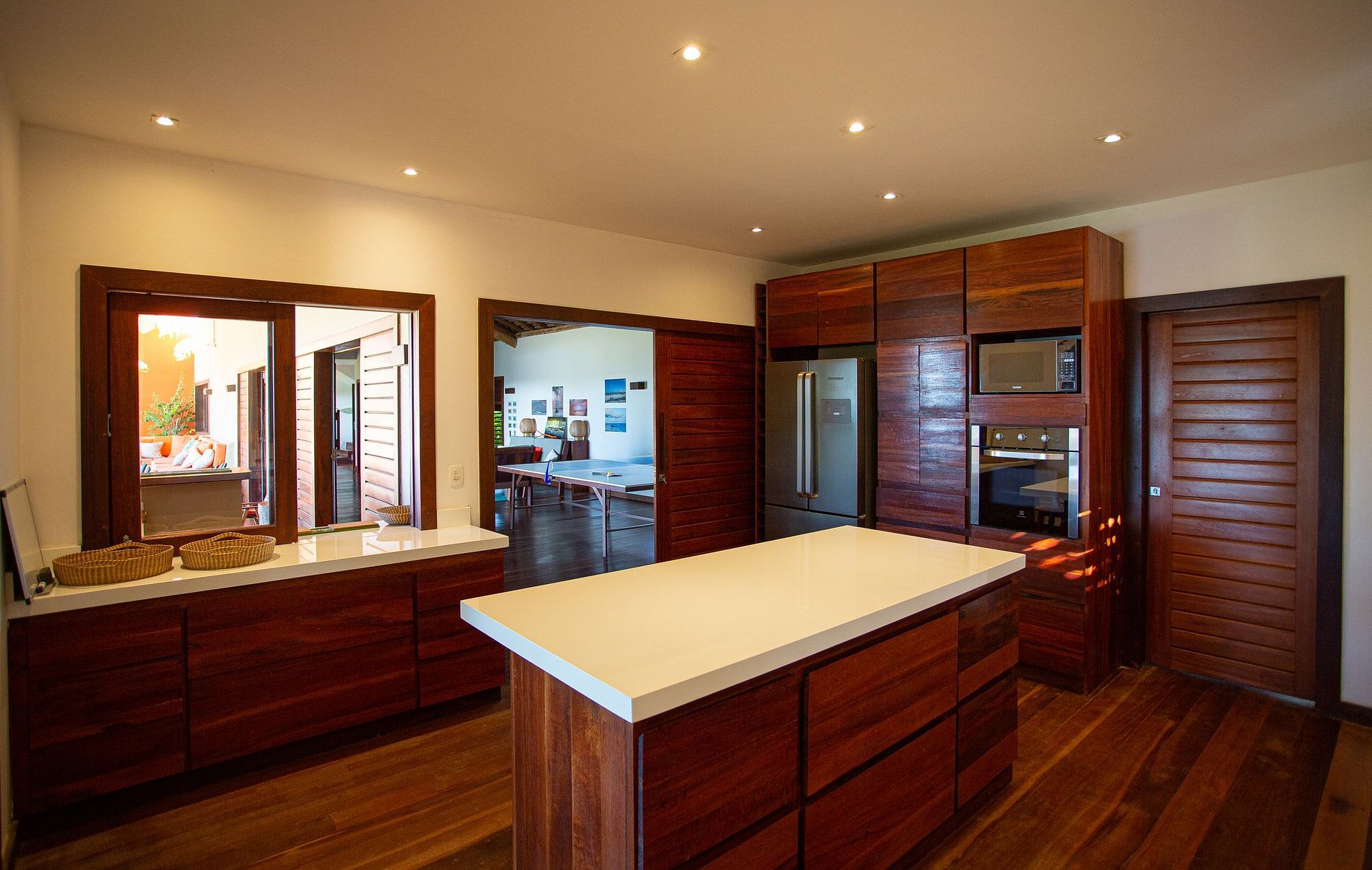 A cozinha se mantem inalterada, seu design original e bem cuidado possuí grande espaço para o preparo de refeições e possuí acesso a área externa da casa com duas mesas de jantar para serem servidas refeições tanto dentro quanto fora de casa.