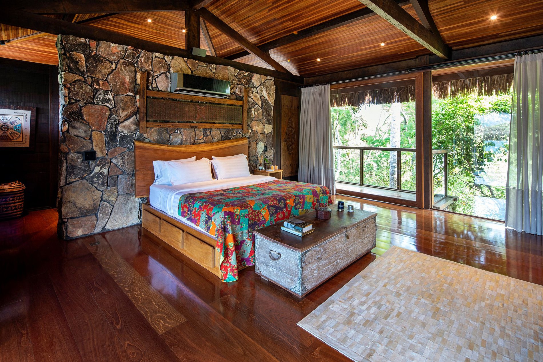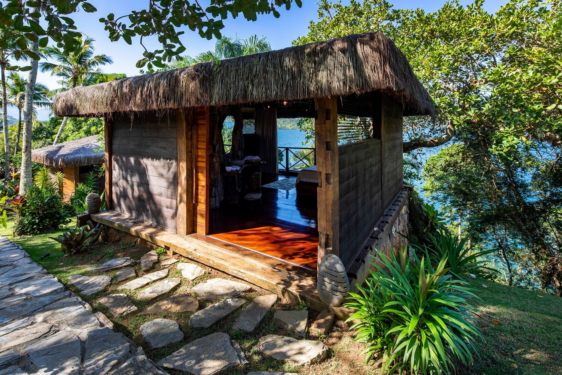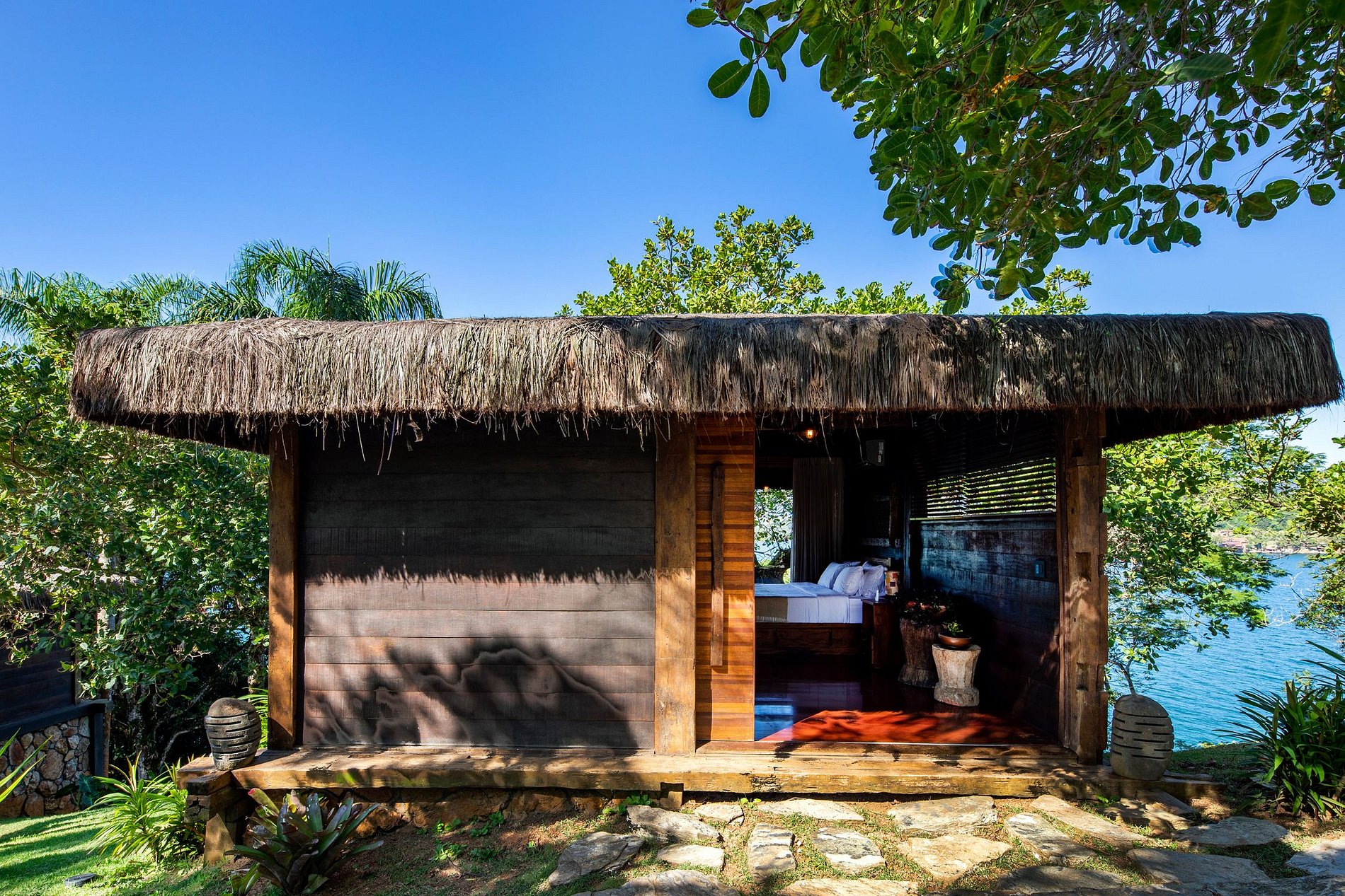 - 5 quartos (Casa Principal: 1 suíte master e 1 suíte king, 2 bungalows e 1 suíte boat house)
