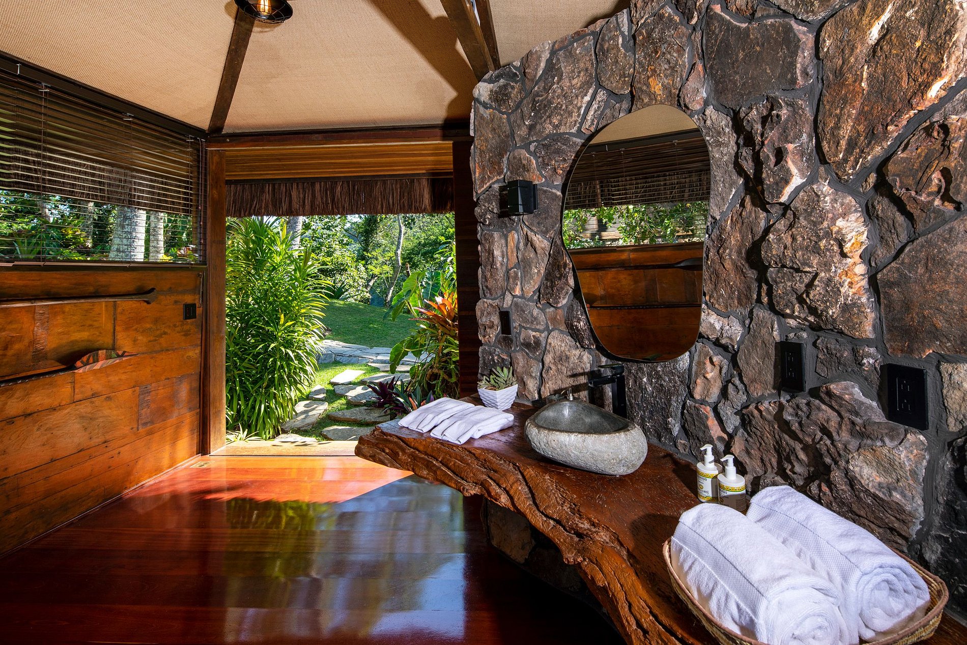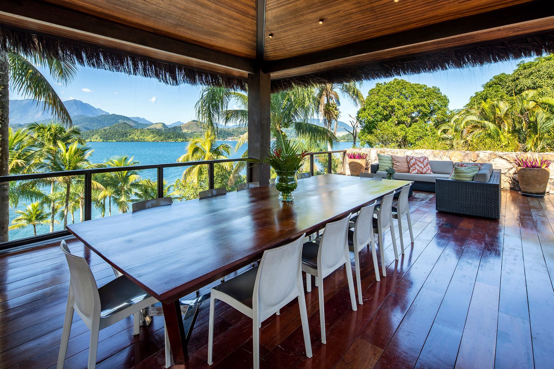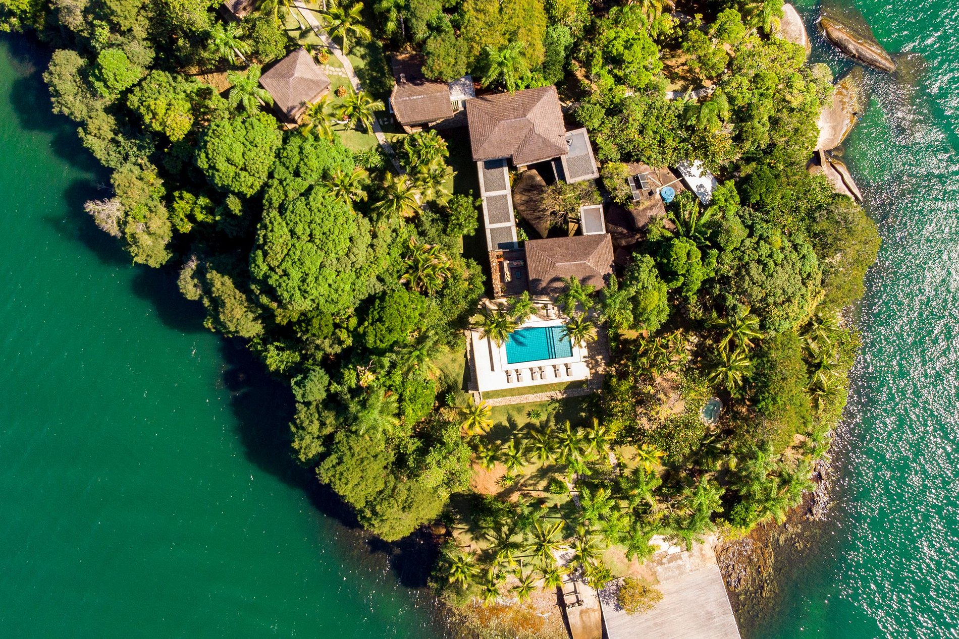- 5 quartos (Casa Principal: 1 suíte master e 1 suíte king, 2 bungalows e 1 suíte boat house)