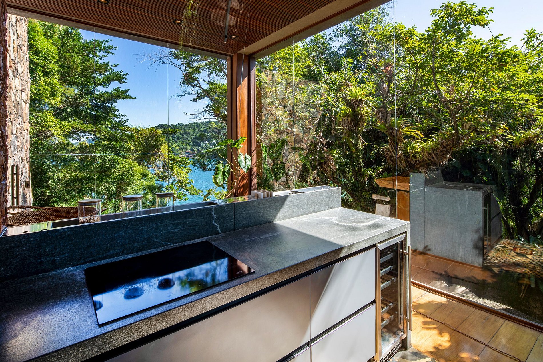 A Ilha conta com áreas comuns criadas para oferecer experiências únicas aos seus visitantes. Dentre elas um lindo terraço externo com sala de jantar e churrasqueira; área de piscina cercada por um deck e estendida por um confortável lounge conectados à Casa Principal por um corredor envidraçado que segue um lago ornamental esculpido, dentre características, por pedras indígenas. Uma área com gazebo, ideal para almoço e relaxamento, um solarium, uma luxuosa Jacuzzi externa com vista para o mar e uma praia privativa.