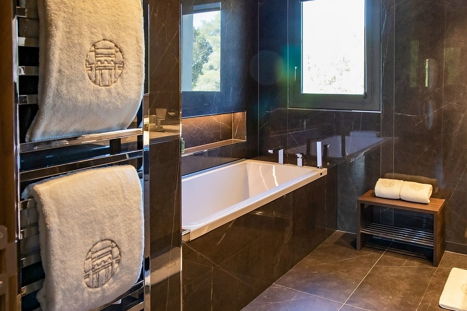 No primeiro piso existe um quarto principal com vista para o jardim, banheiro independente e outro quarto com vista para a piscina e banheiro independente. Além disso, acesso à lavanderia totalmente equipada e banheiro independente para hóspedes. O primeiro andar é composto por uma suite júnior com vista para a piscina e um banheiro independente, vestiário, lavabo separado, varanda e terraço. Mais uma suíte júnior com vista para a piscina, banheiro independente com closet, lavabo separado, varanda e terraço.