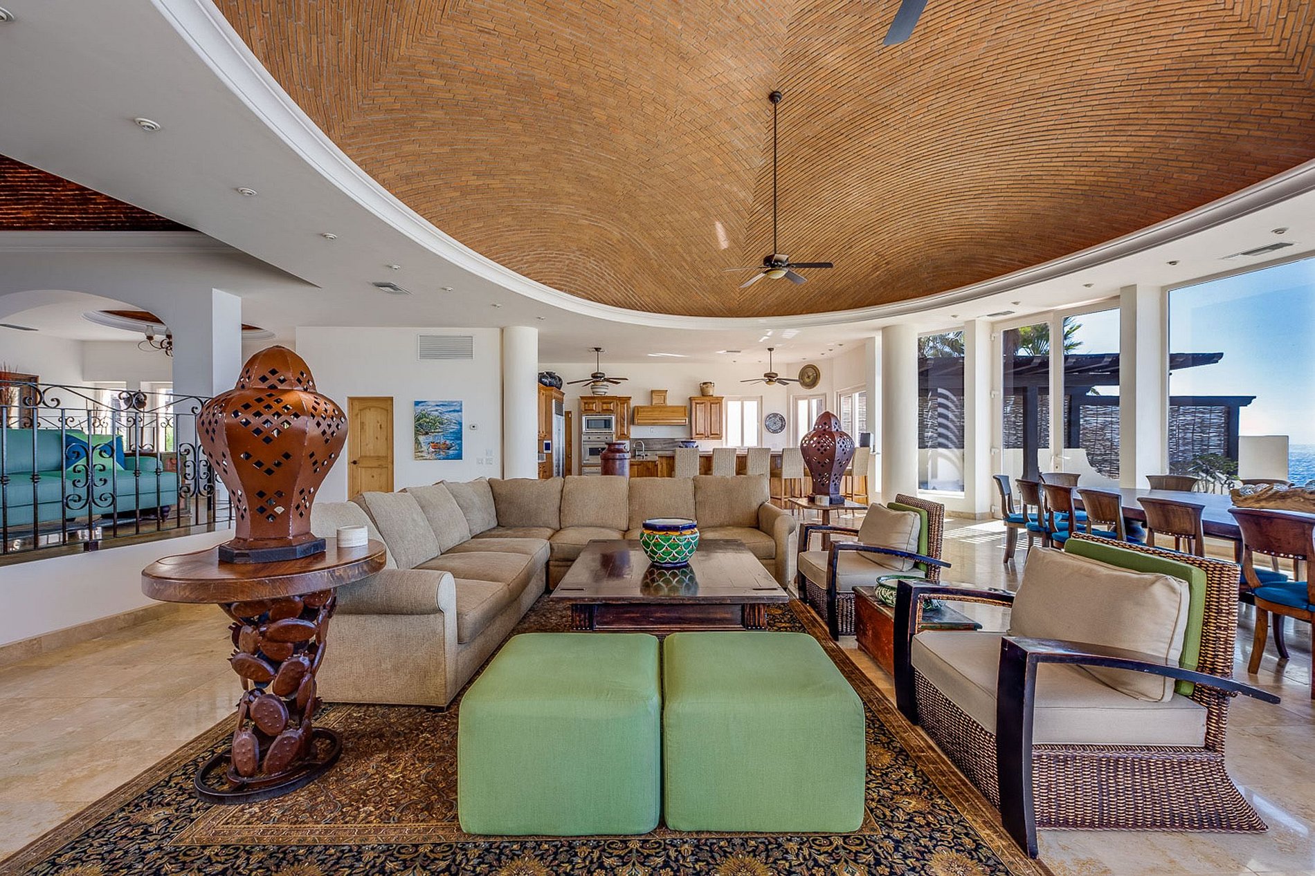 Em sua enorme sala principal, cujo teto é abobadado de tijolos, dando um toque rústico ao ambiente, as janelas permitem uma vista única panôramica para o mar e para a encantadora piscina, no terraço da propriedade. Suas grandes janelas, quando abertas, permitem que a brisa fresca e pura do mar adentre a mansão, refrescando seus interiores naturalmente.