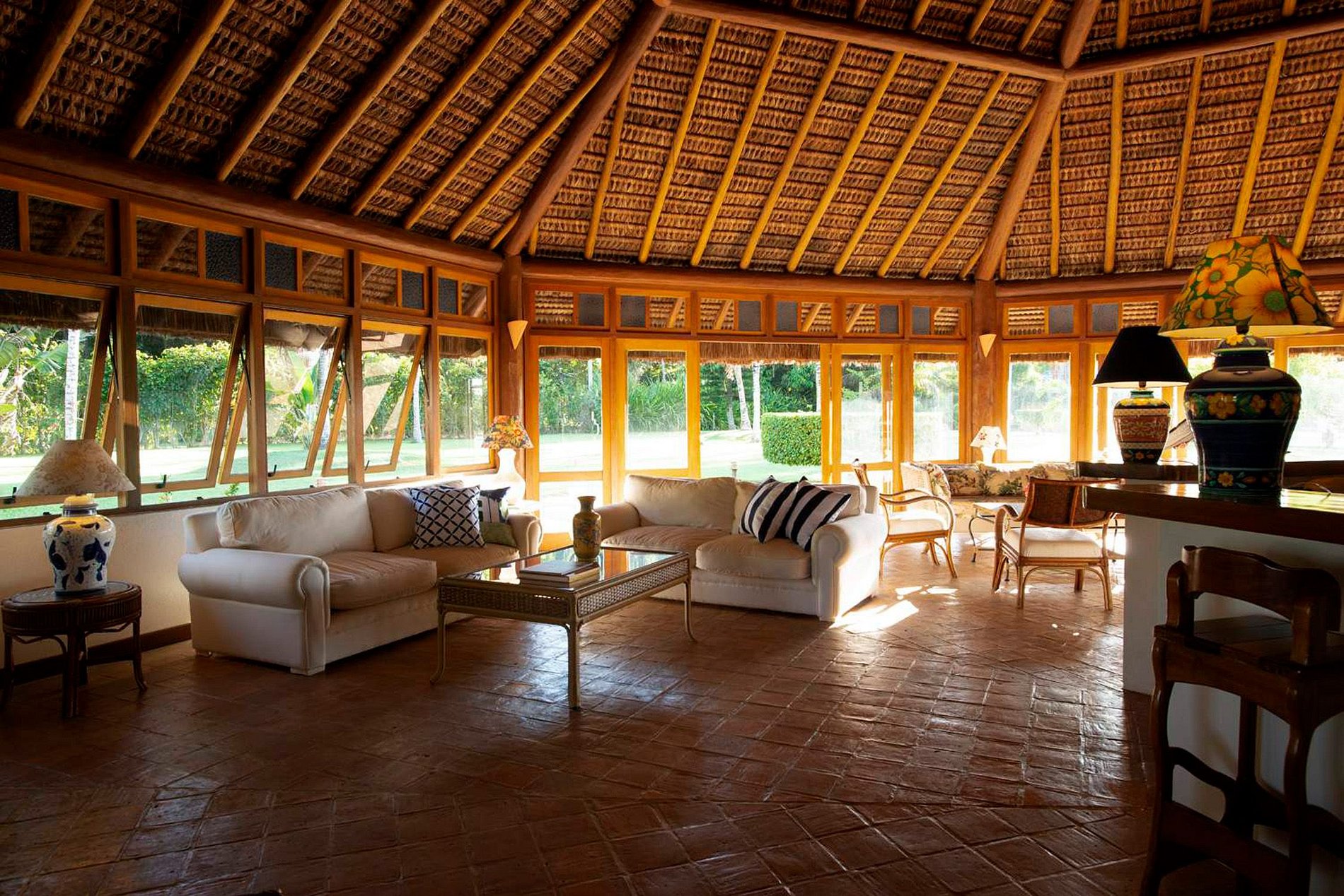 A grande área social, com pé direito alto, é ricamente decorado com moveis colonial. Luminosa, ela oferece um espaço de vida perfeito, a poucos passos de a grande piscina e do seus pergolados.