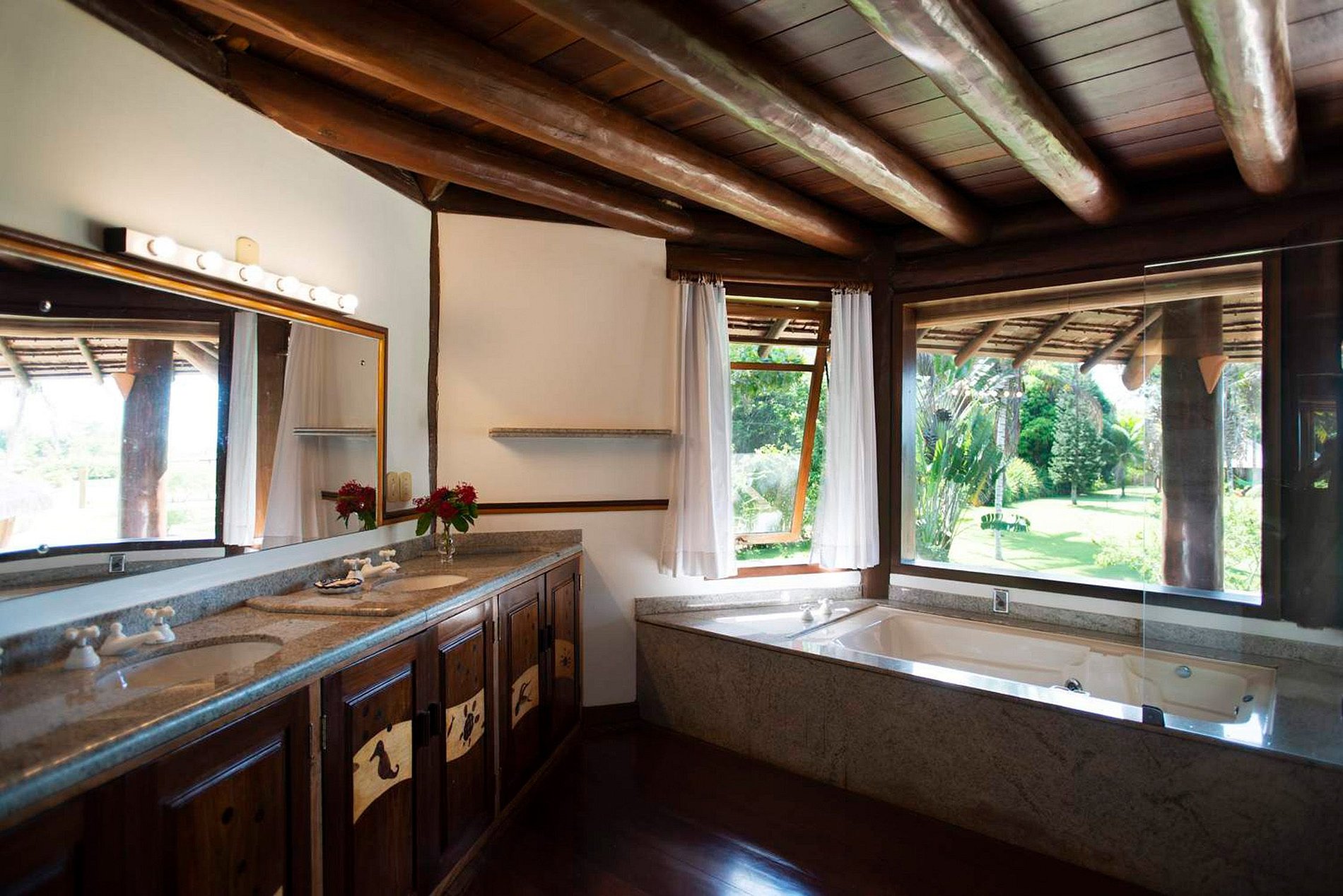 Suite 5: Cama casal, ar condicionado, mosqueteiro, vista piscina e jardim.