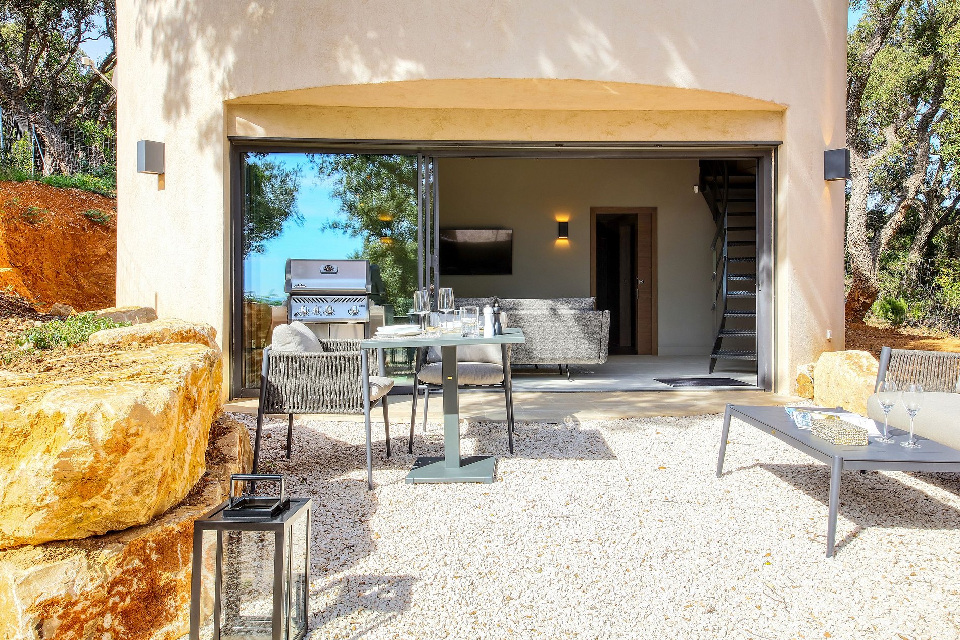 Villa localizada em La Croix - Valmer é uma residência intimista e atípica, aninhada no coração do parque, entre carvalhos e oliveiras com vista para o Mediterrâneo, tornando-se o lugar ideal para uma estadia discreta perto da natureza.