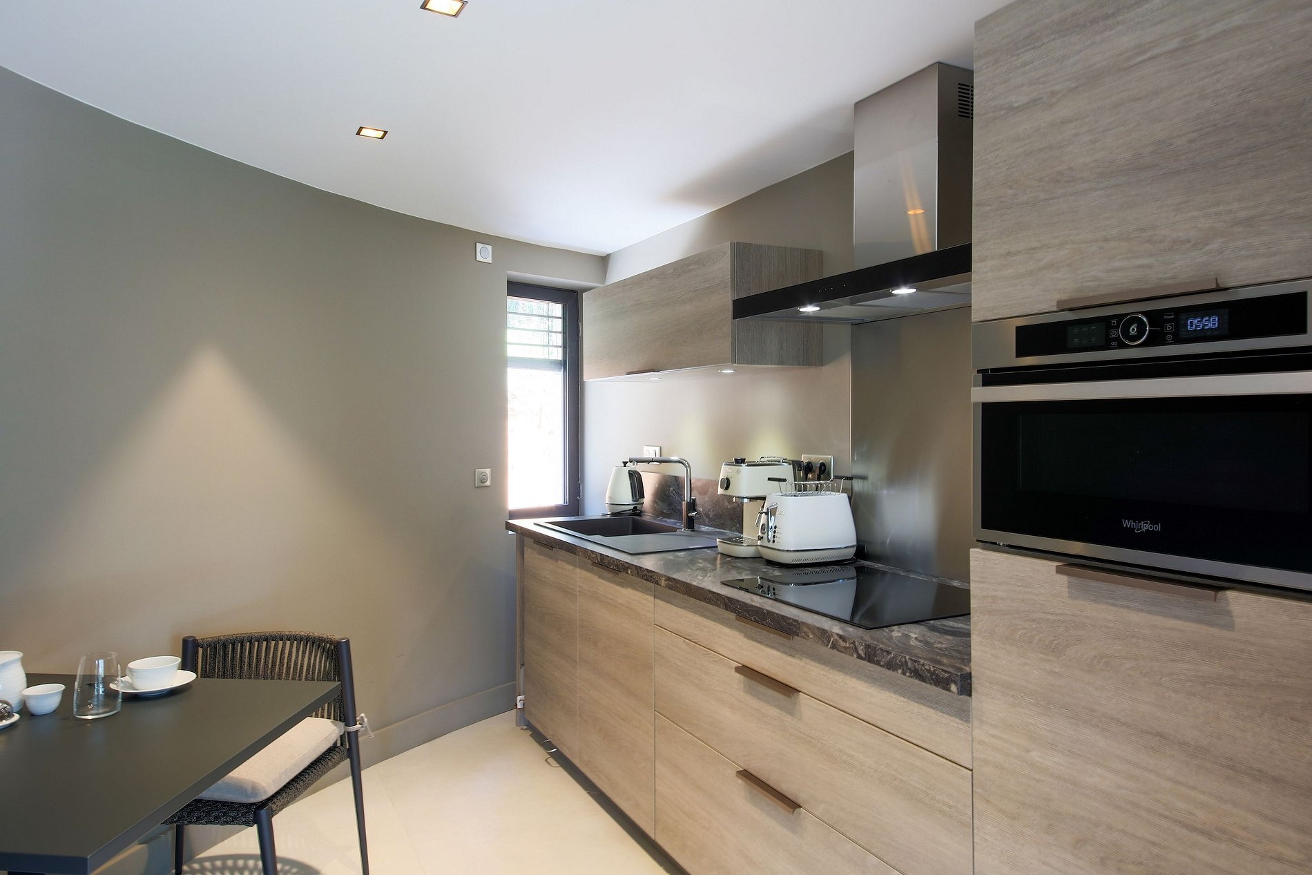 Tem 68m² de área interior: sala de estar, cozinha familiar aberta totalmente equipada, terraço com vista mar, um quarto com vestiários e um banheiro. As áreas externas incluem banho nórdico, churrasqueira, acesso direto ao parque e à horta, estacionamento privativo na lateral da villa e acesso ao heliporto mediante solicitação.