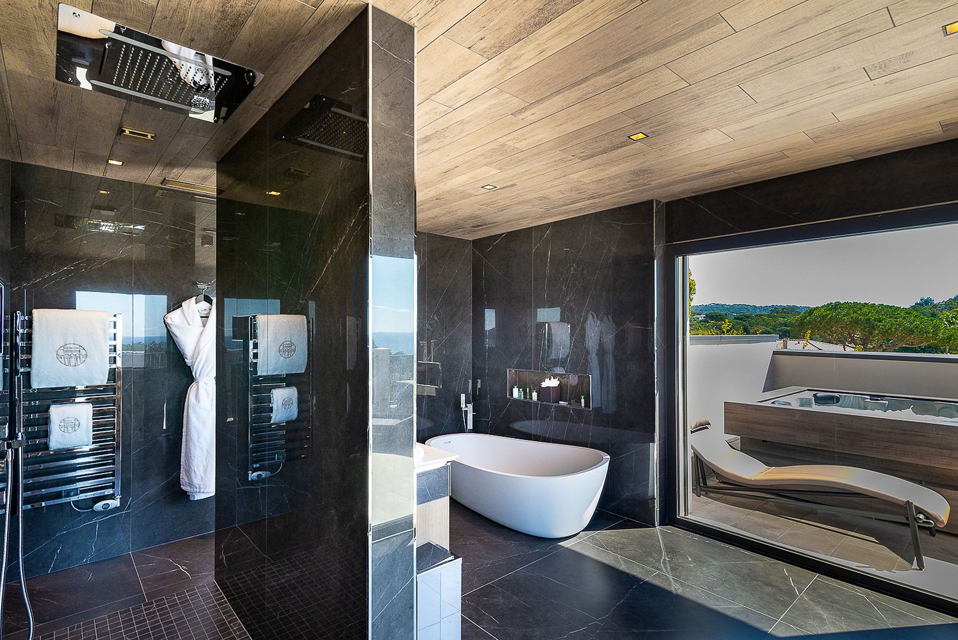 Villa de 390 m² de espaço interior composto por uma residência principal e dois anexos, uma piscina infinita aquecida com uma casa de piscina e um jacuzzi no terraço do último piso. Você apreciará particularmente sua vista panorâmica do Mediterrâneo e das ilhas douradas, bem como sua espaçosa esplanada totalmente equipada.