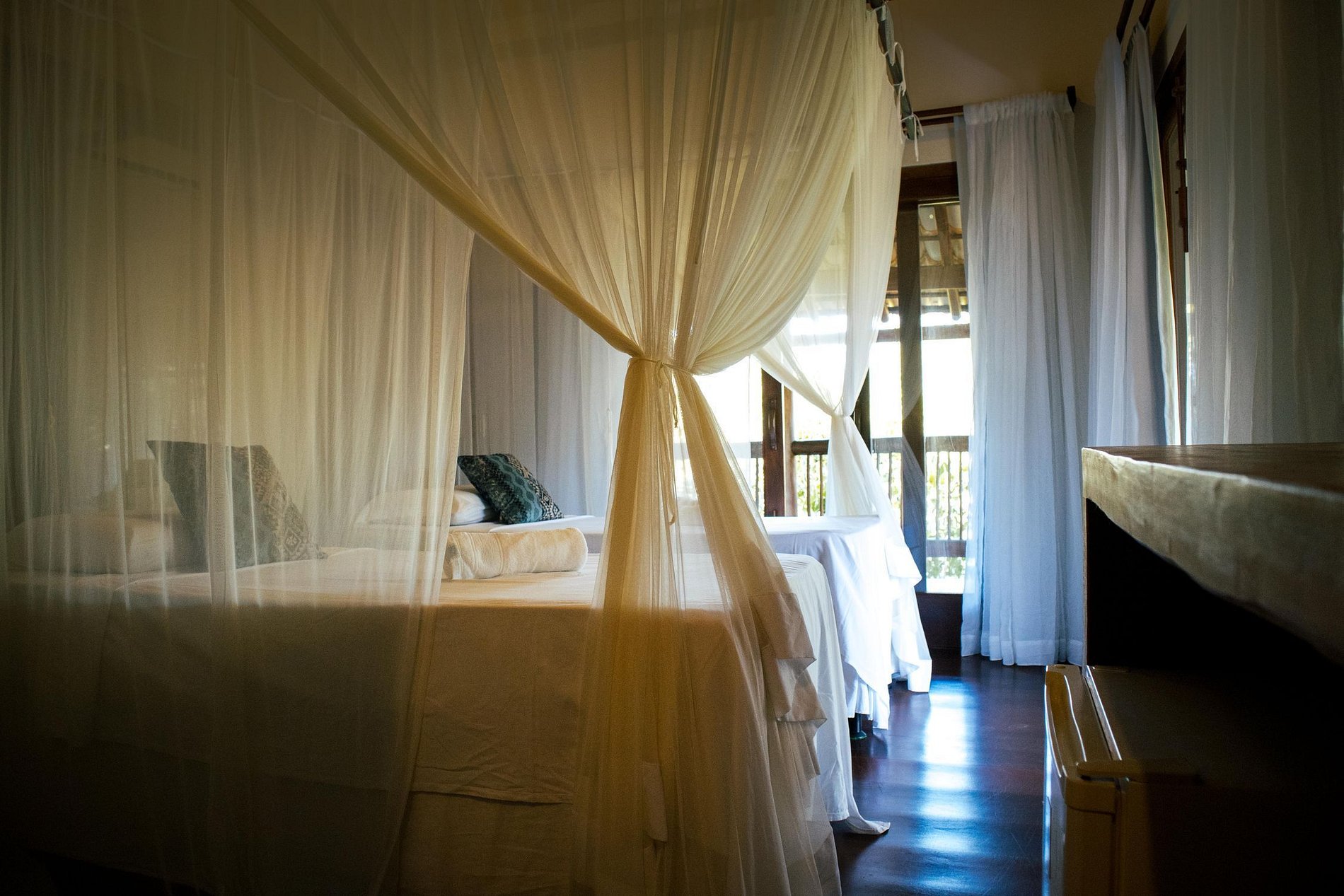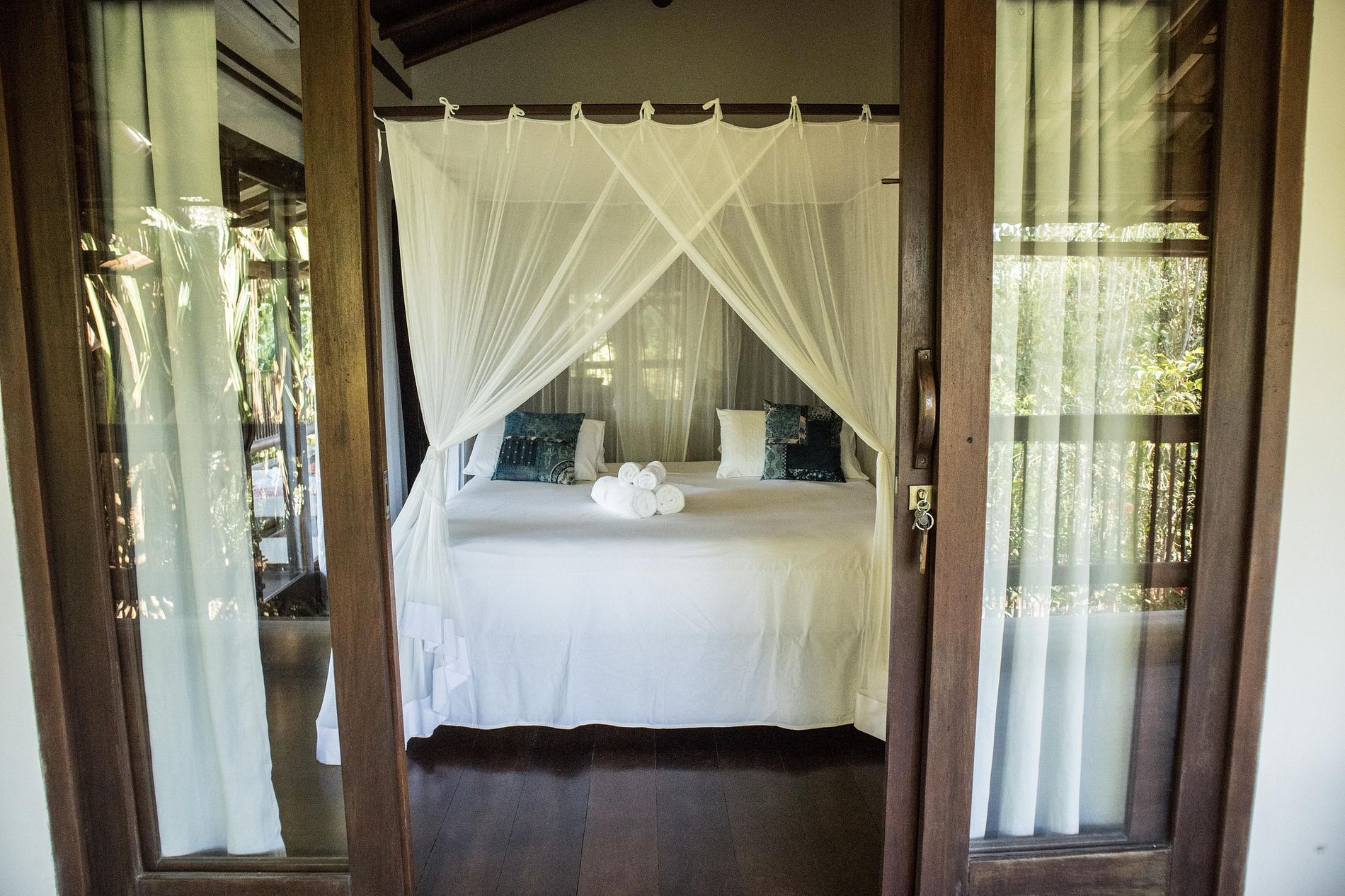 Suite 4: Cama casal, mosqueteiro, ar condicionado, varanda com rede, vista jardim.