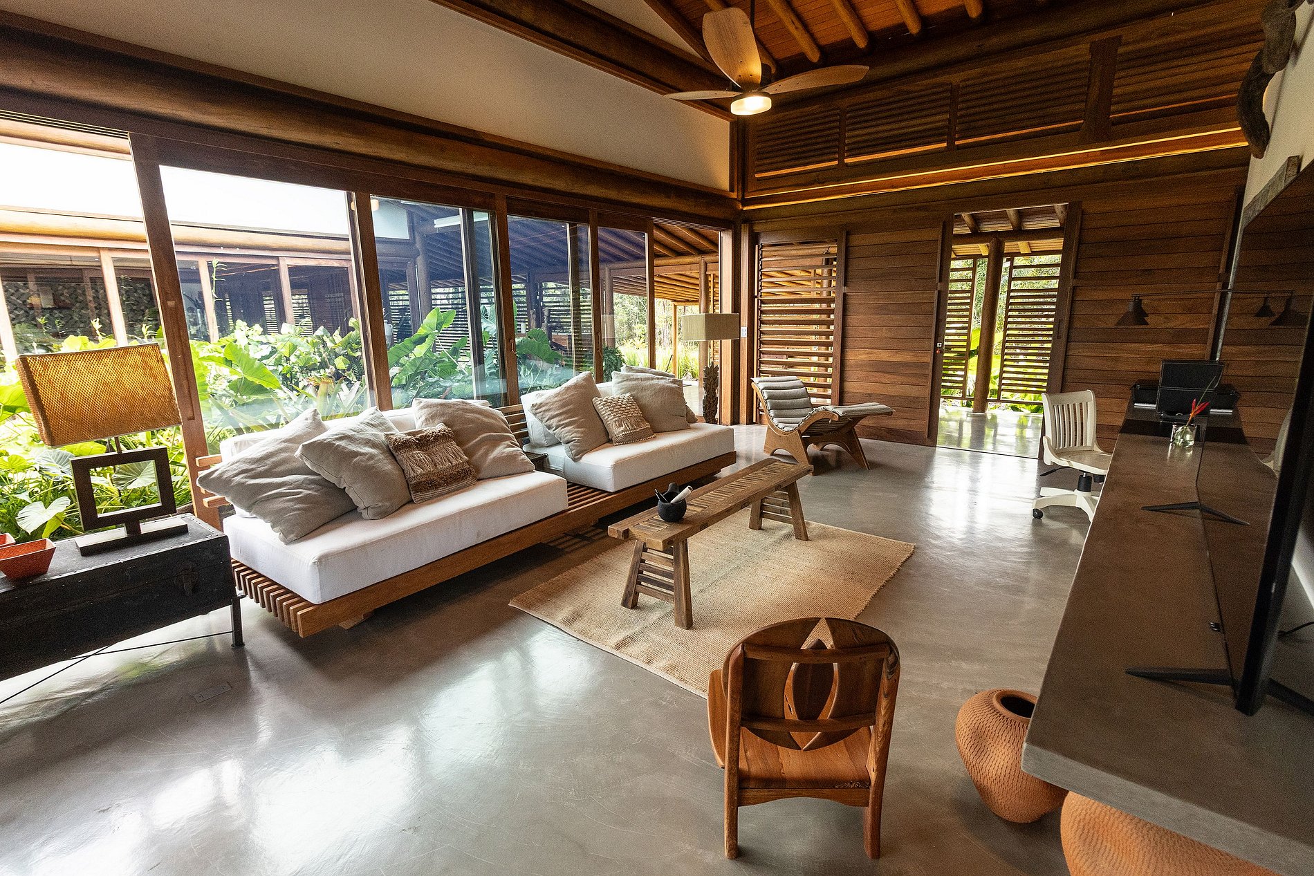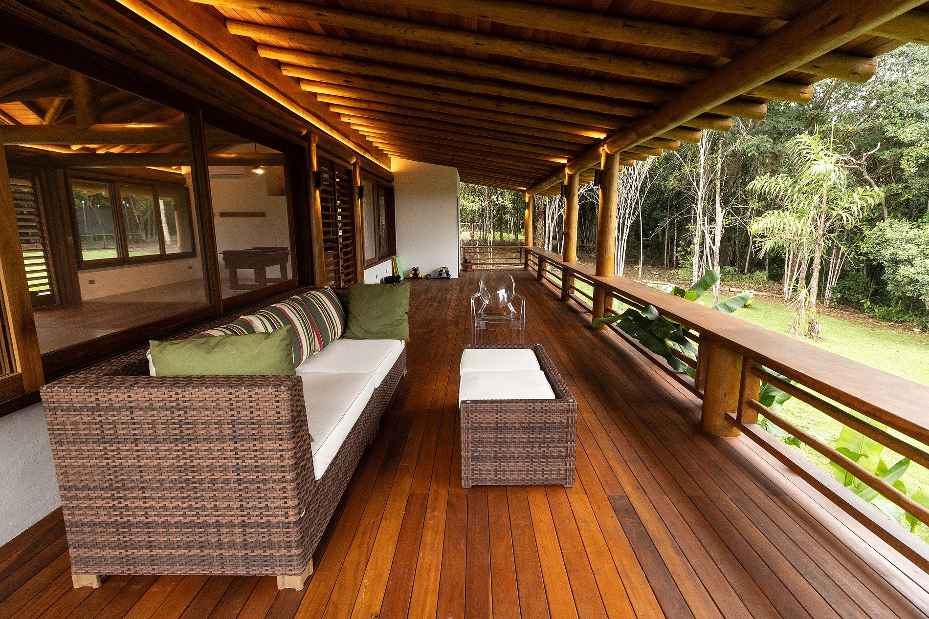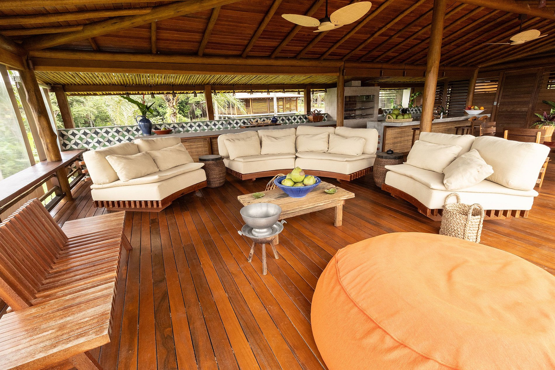 Acomodações: a Casa principal com 3 suítes amplas (camas super king). Bela sala de estar com sofás e poltronas confortáveis intimistas para uma boa conversa. A vista da sala está a piscina, com revestimento de ladrinhos verde harmonizando as cores do entorno. Ao lado está cozinha gourmet com preciosa churrasqueira, forno a lenha, e uma mesa de refeições para 16 pessoas. Os dois bangalôs independentes, cada um com 2 quartos e 1 banheiro, sala e varanda com vista para o mar e a Mata Atlântica. E o pavilhão multiuso para aulas de yoga, eventos ou lazer, equipado com mesa de ping pong, bilhar e pebolim.