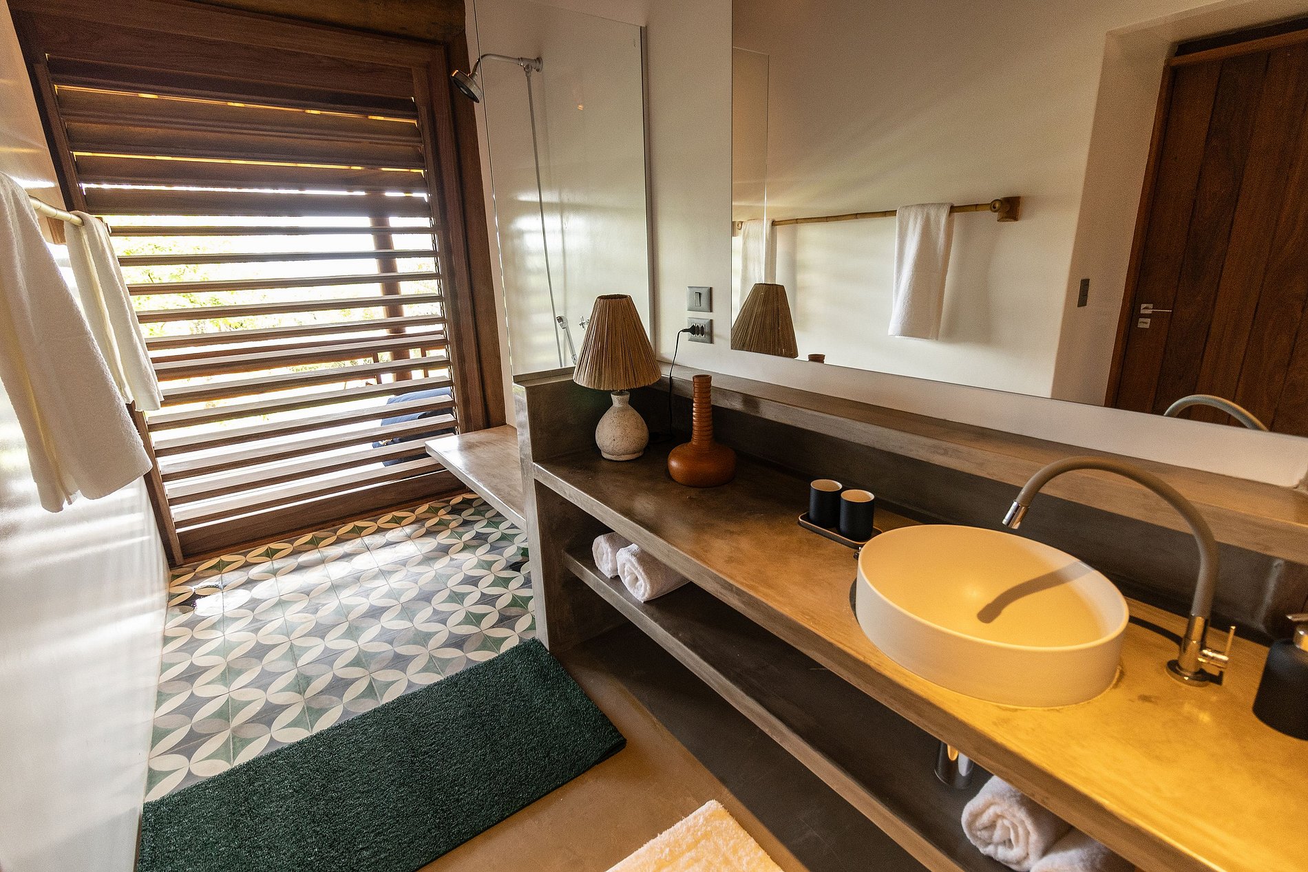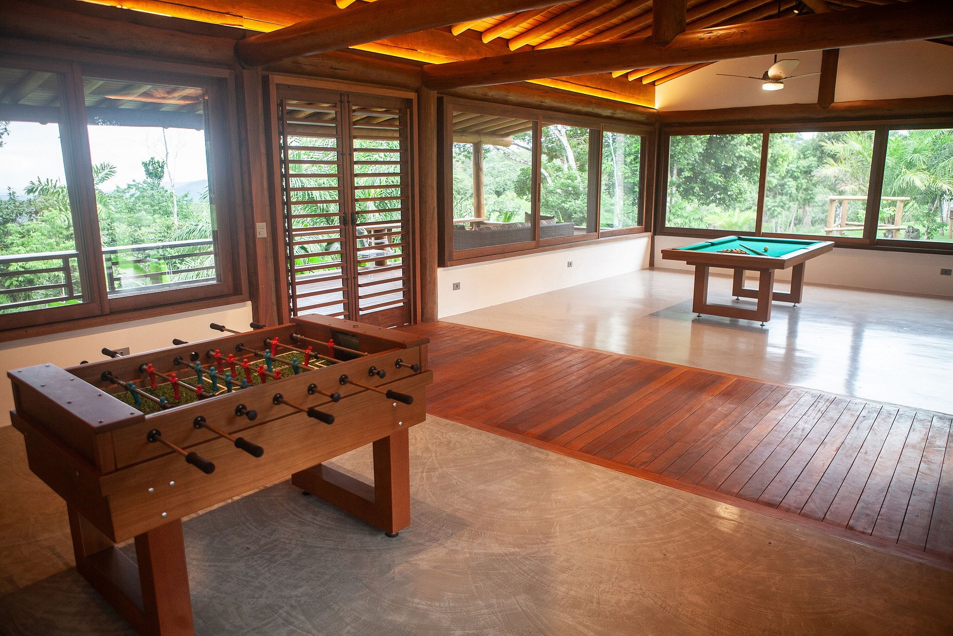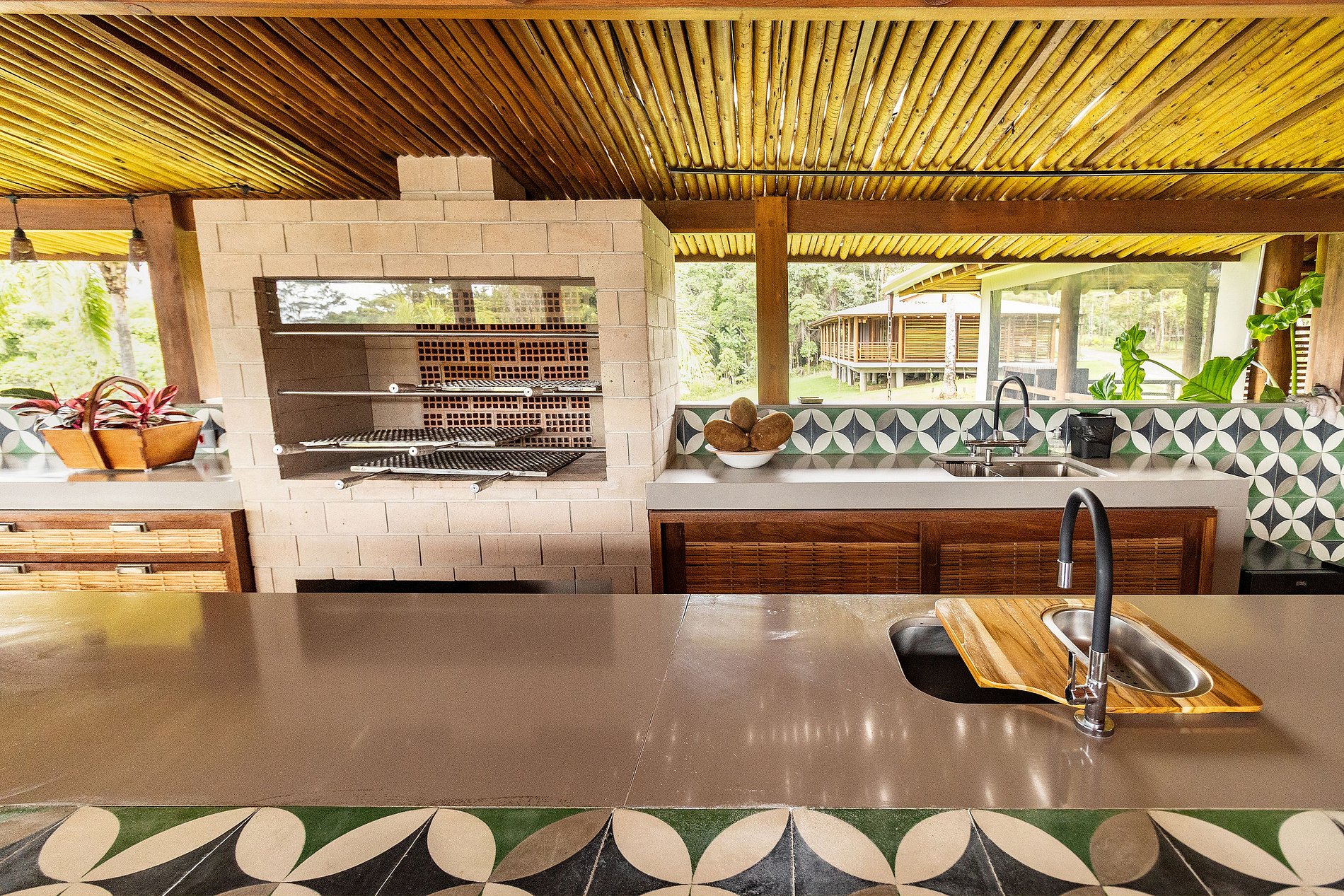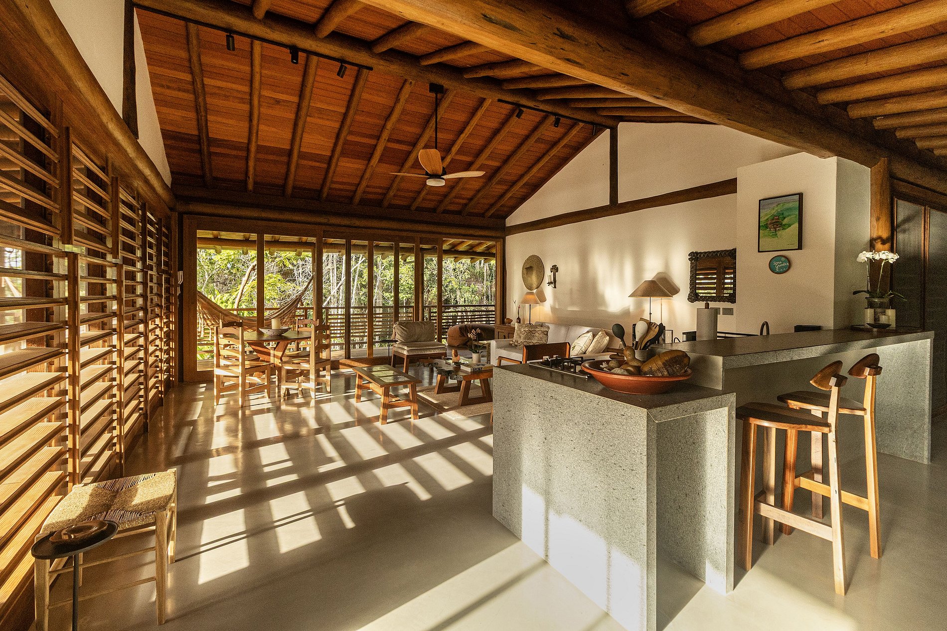 Acomodações: a Casa principal com 3 suítes amplas (camas super king). Bela sala de estar com sofás e poltronas confortáveis intimistas para uma boa conversa. A vista da sala está a piscina, com revestimento de ladrinhos verde harmonizando as cores do entorno. Ao lado está cozinha gourmet com preciosa churrasqueira, forno a lenha, e uma mesa de refeições para 16 pessoas. Os dois bangalôs independentes, cada um com 2 quartos e 1 banheiro, sala e varanda com vista para o mar e a Mata Atlântica. E o pavilhão multiuso para aulas de yoga, eventos ou lazer, equipado com mesa de ping pong, bilhar e pebolim.