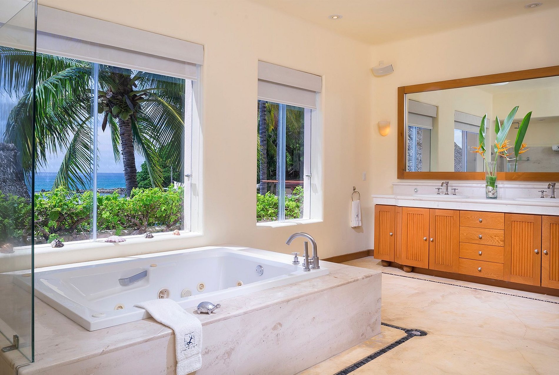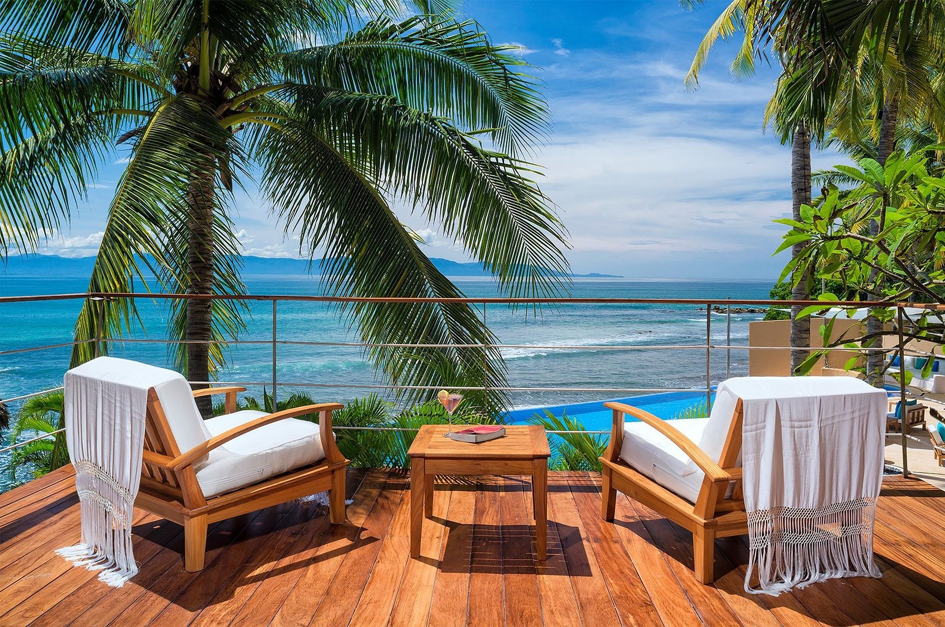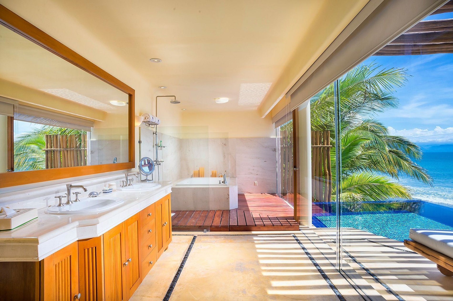 Cama king size, sala de estar com TV, banheiro grande e aberto com terraço e piscina privativa com vista para o mar, jacuzzi e chuveiro ao ar livre.