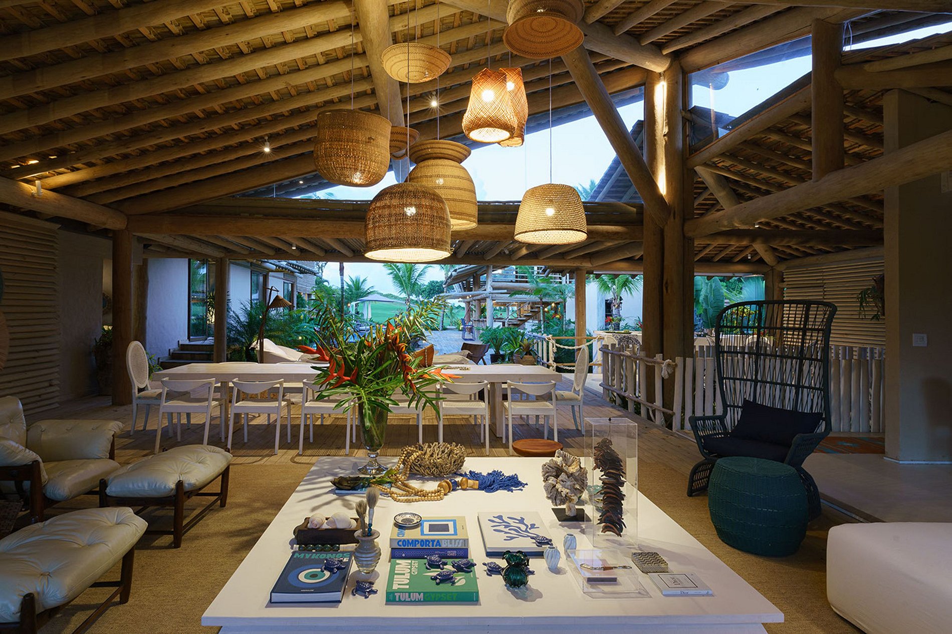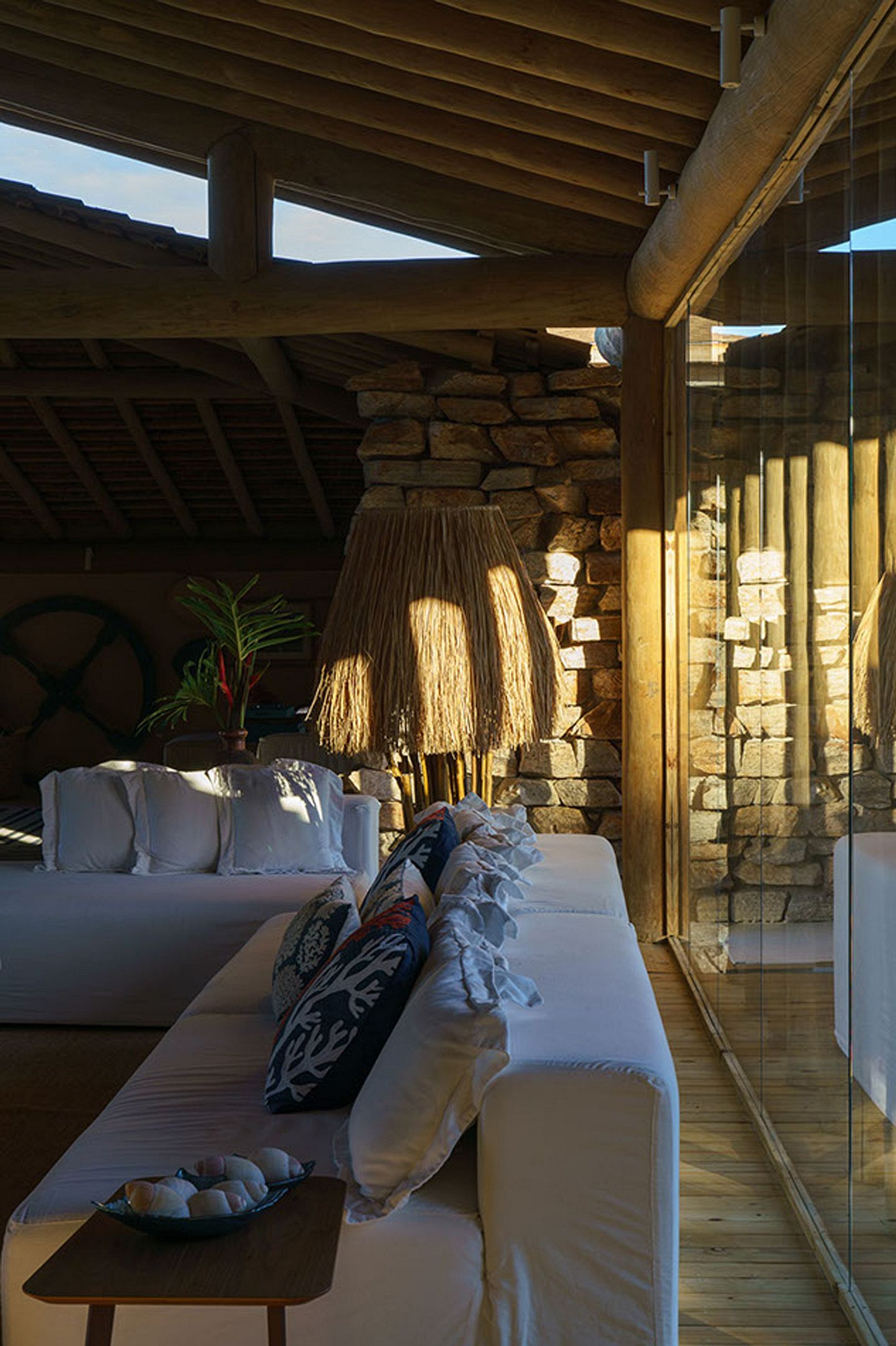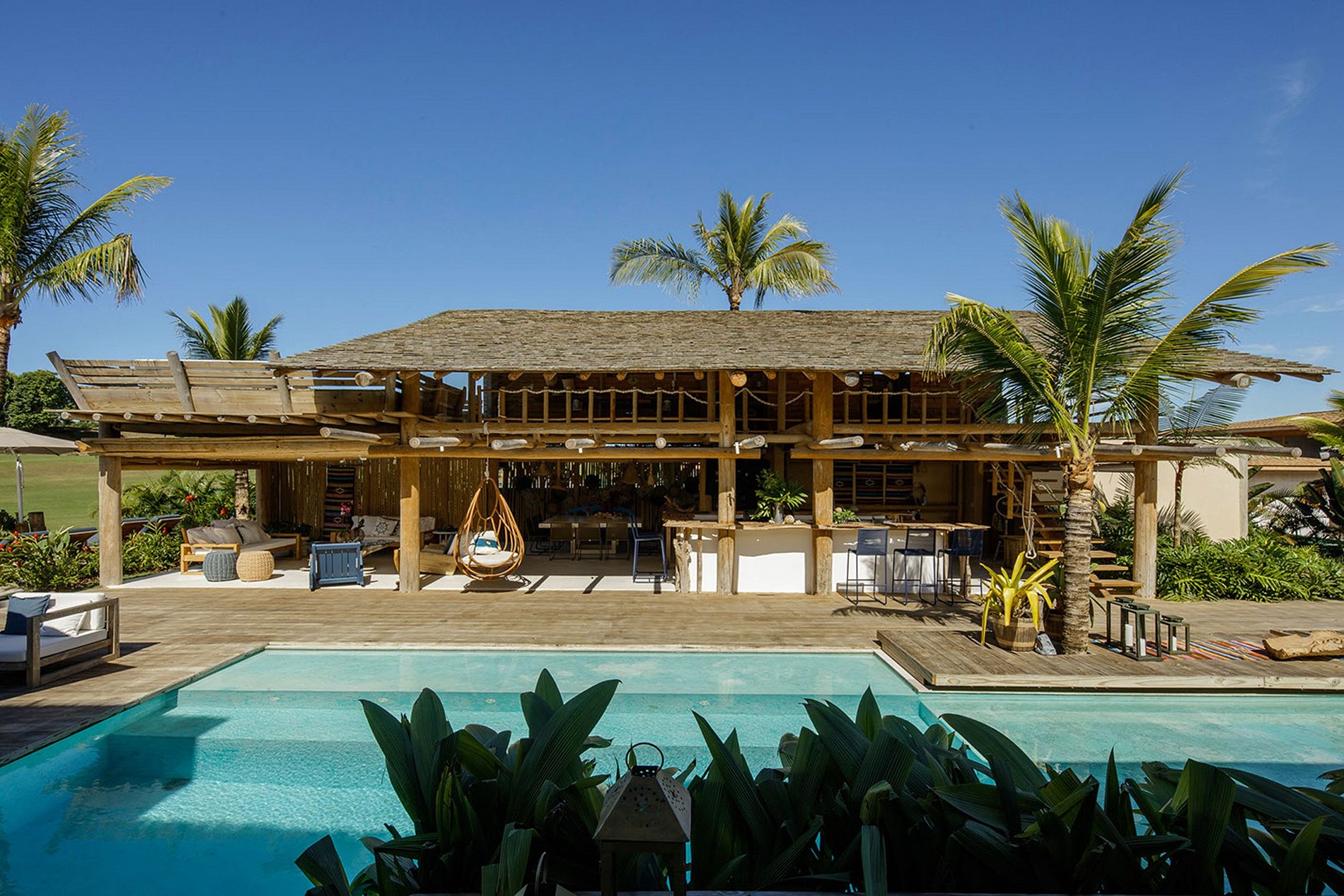 A fachada frontal bem integrada ao exuberante paisagismo, torna-se a casa em discreta. No entanto, reserva um excelente ambiente interno. Construída com elementos naturais de madeira e pedra. Aproveita também a ventilação natural da Bahia, através de ambientes abertos.