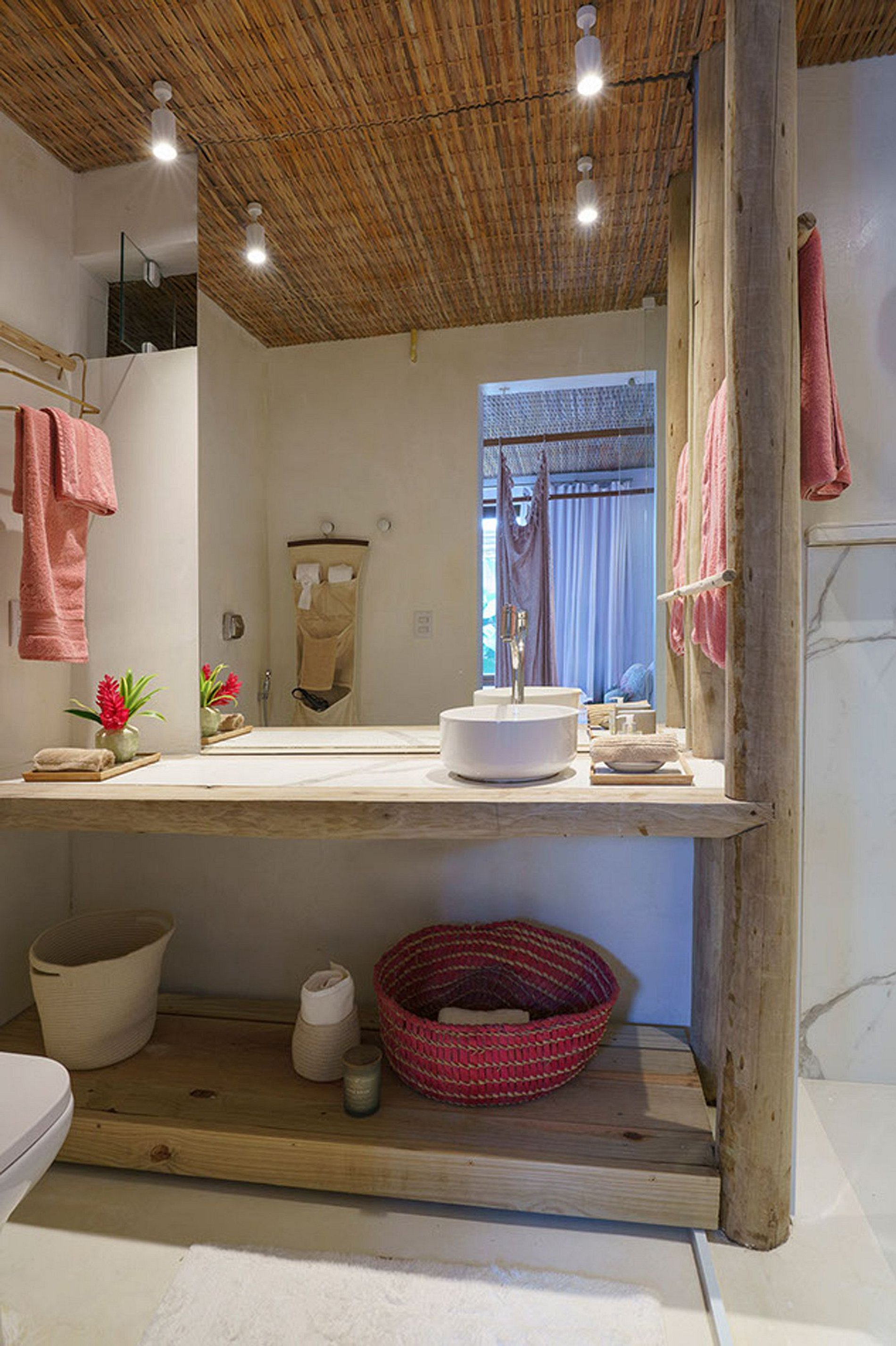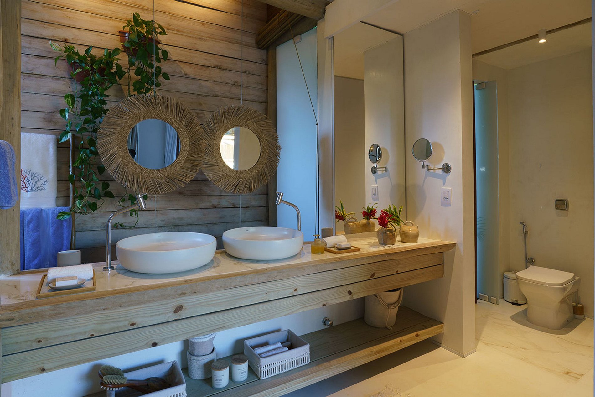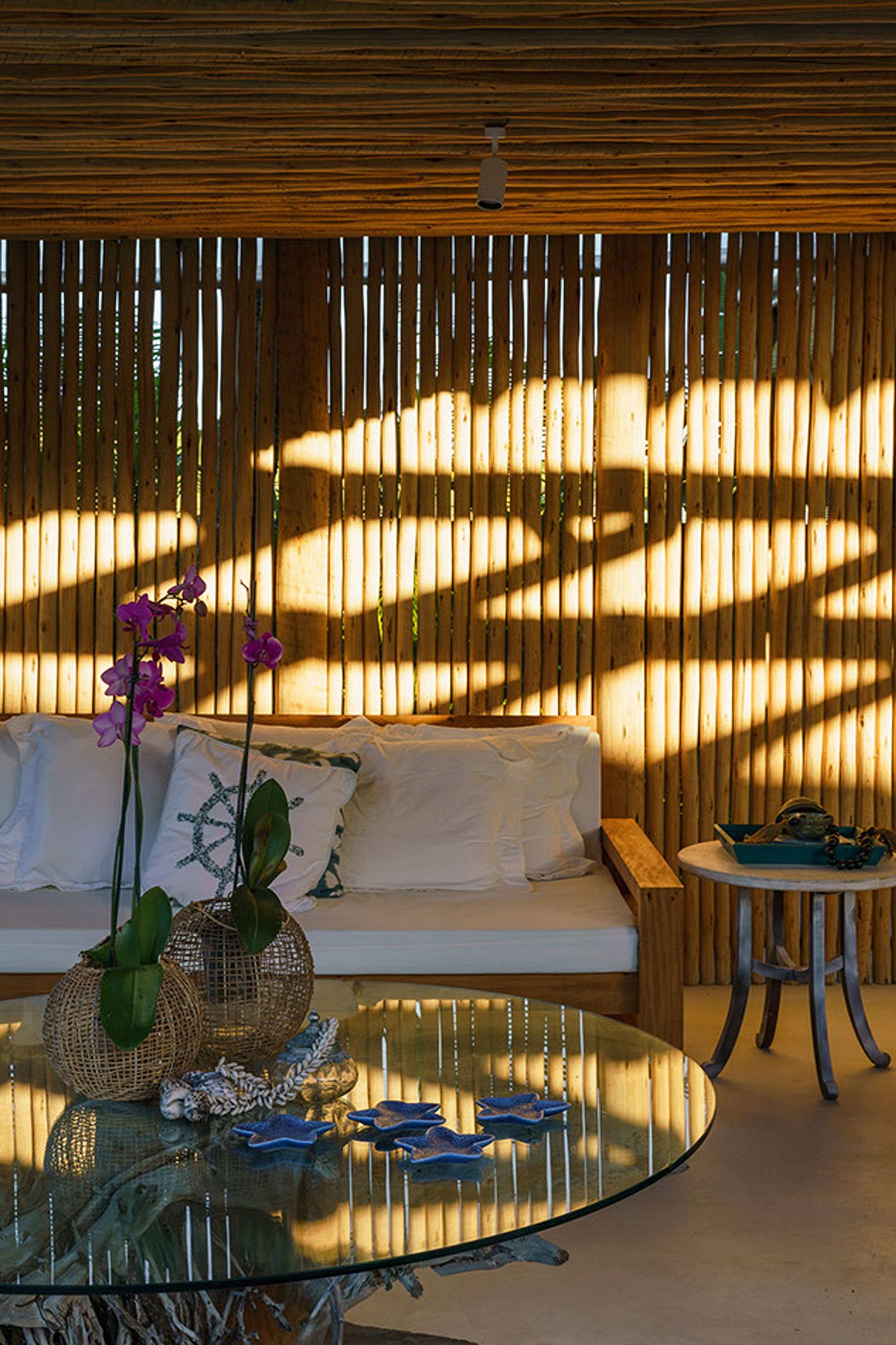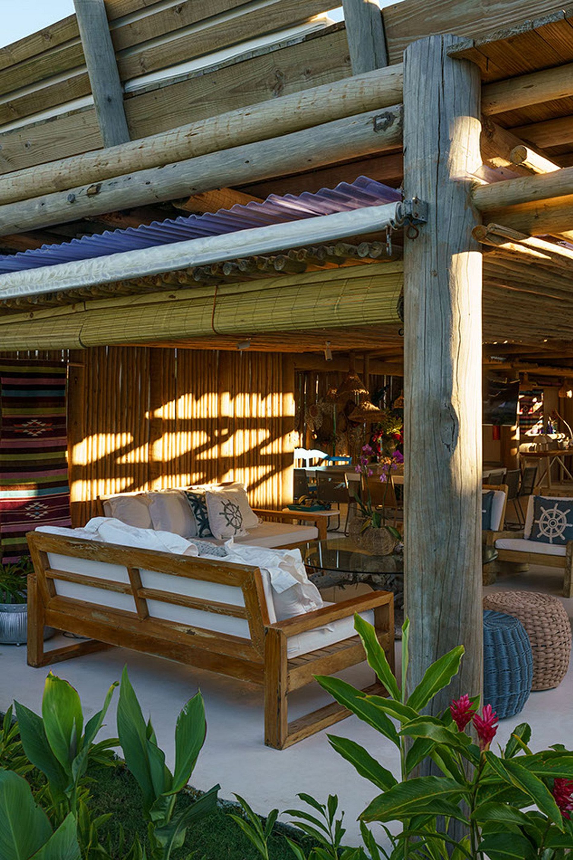A fachada frontal bem integrada ao exuberante paisagismo, torna-se a casa em discreta. No entanto, reserva um excelente ambiente interno. Construída com elementos naturais de madeira e pedra. Aproveita também a ventilação natural da Bahia, através de ambientes abertos.