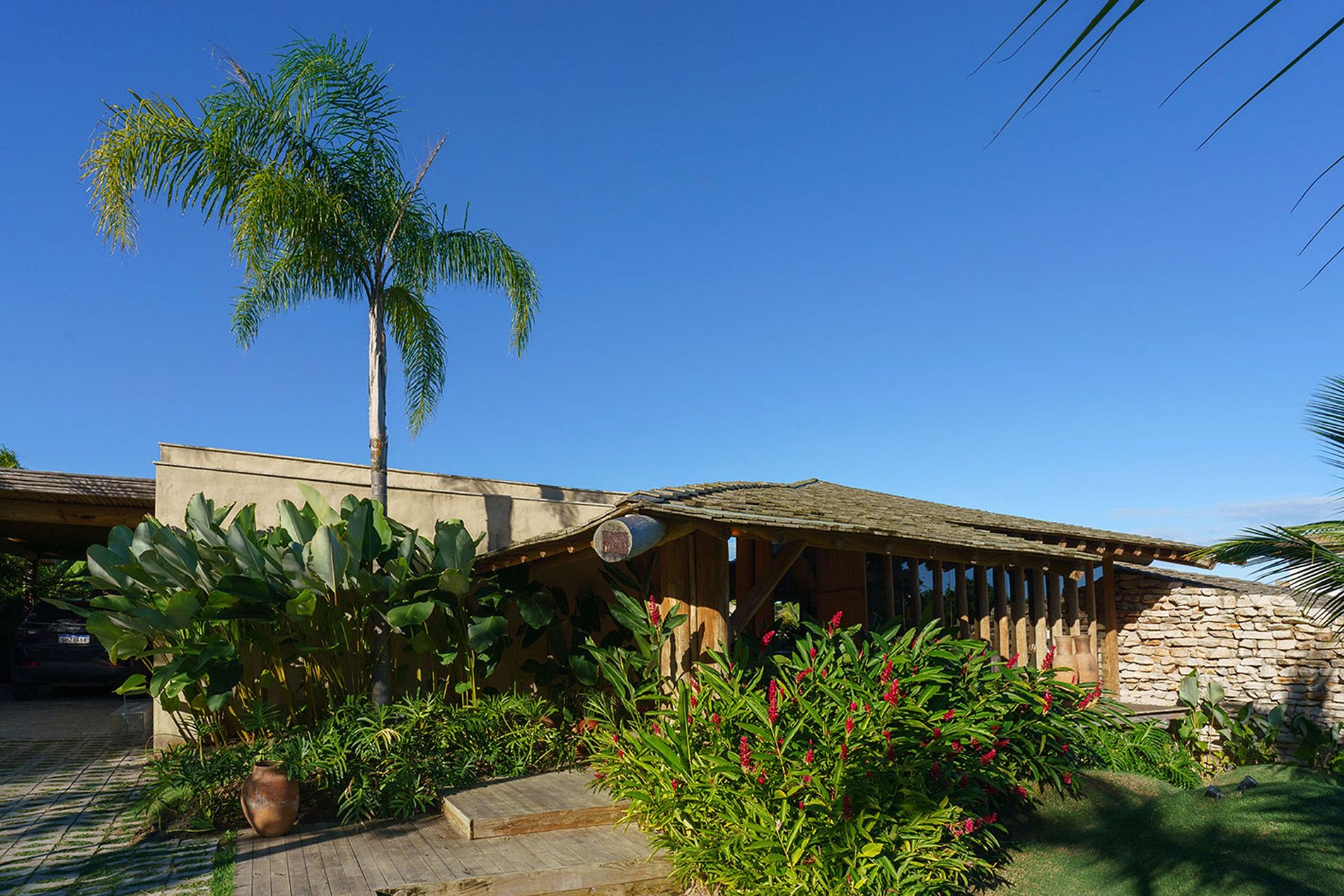 A fachada frontal bem integrada ao exuberante paisagismo, torna-se a casa em discreta. No entanto, reserva um excelente ambiente interno. Construída com elementos naturais de madeira e pedra. Aproveita também a ventilação natural da Bahia, através de ambientes abertos.