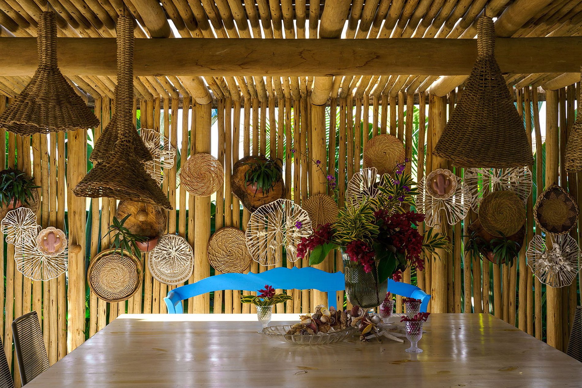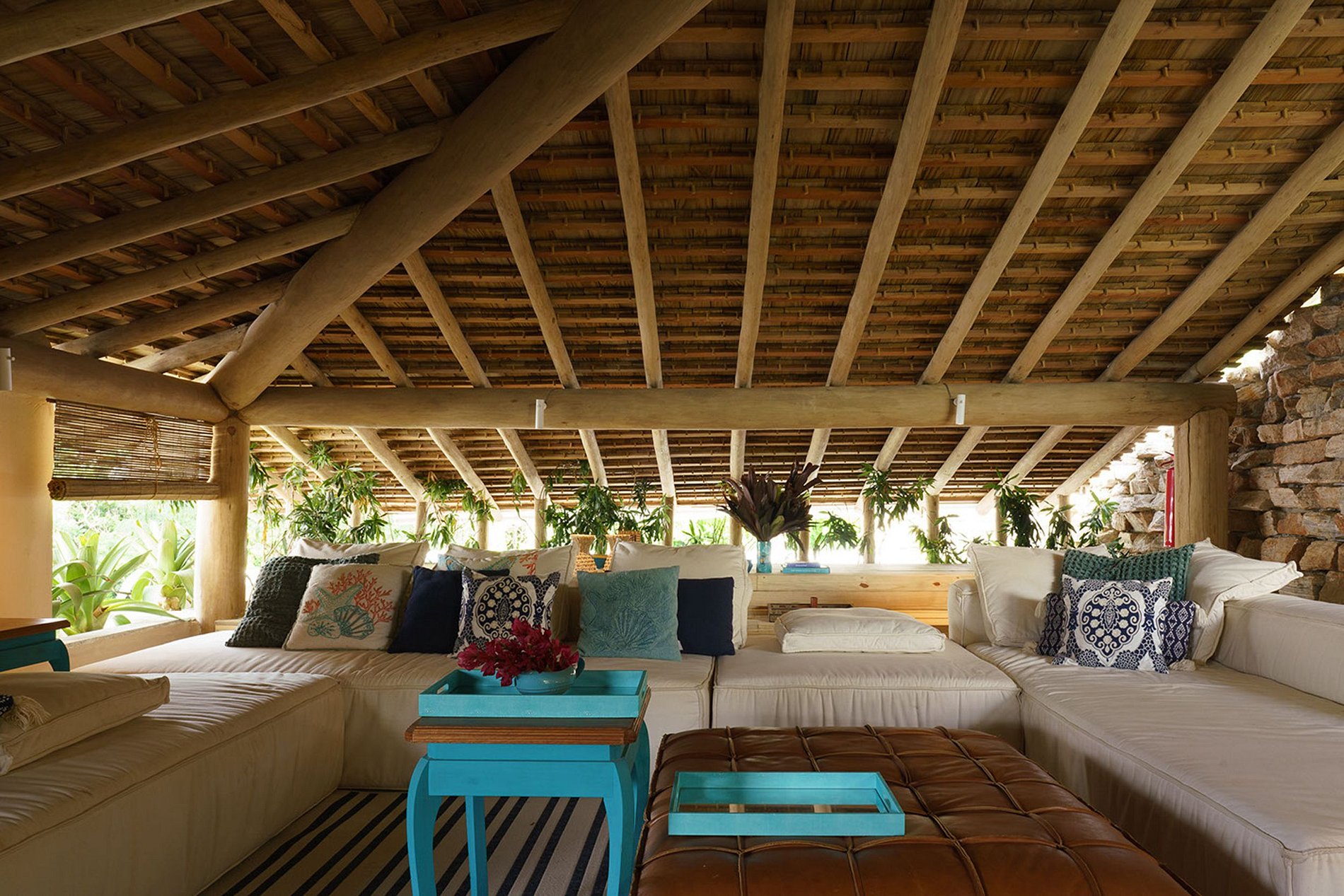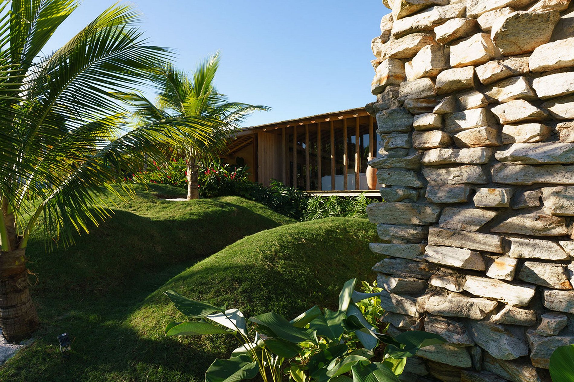 A fachada frontal bem integrada ao exuberante paisagismo, torna-se a casa em discreta. No entanto, reserva um excelente ambiente interno. Construída com elementos naturais de madeira e pedra. Aproveita também a ventilação natural da Bahia, através de ambientes abertos.