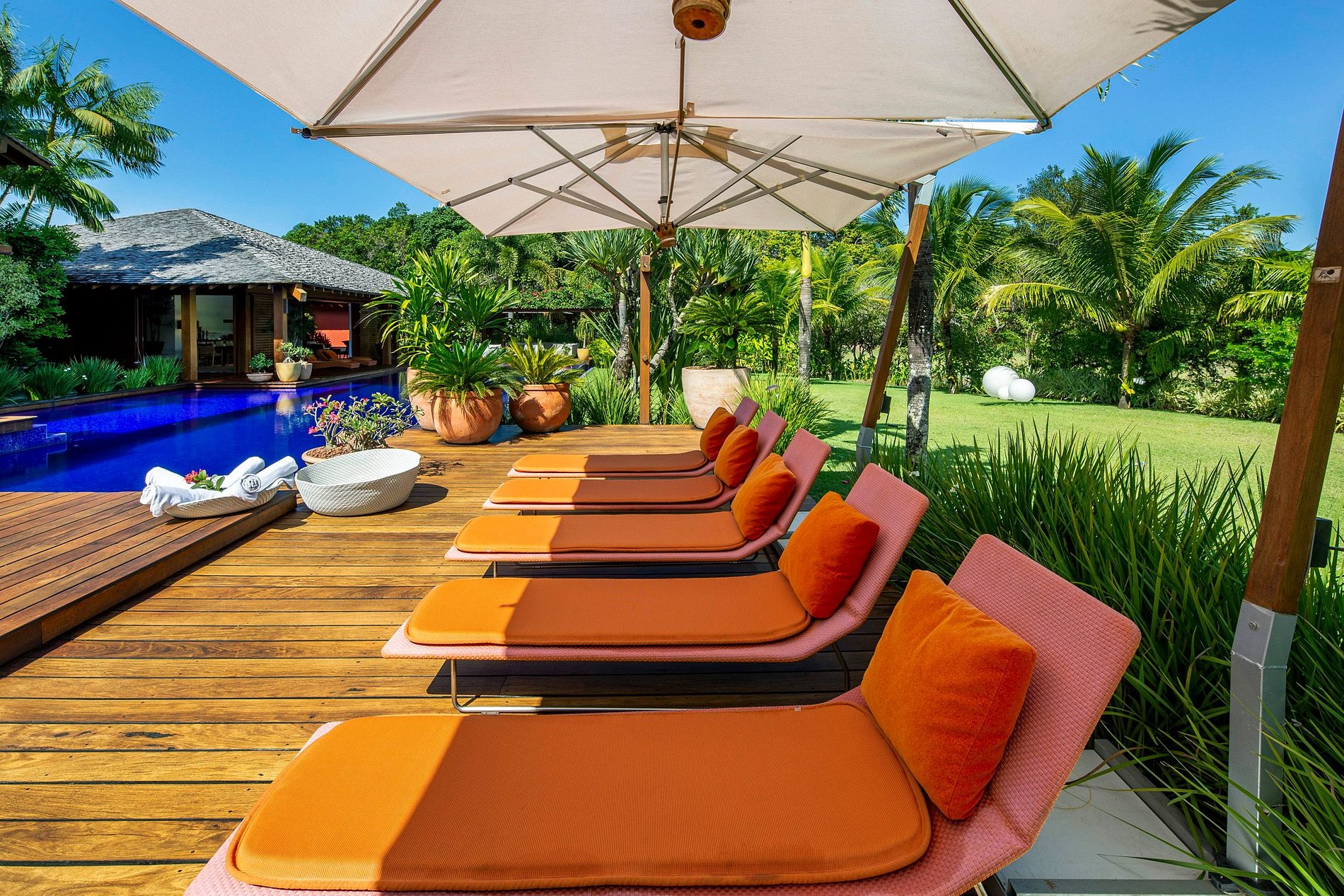 A gigantesca piscina e a fantástica área de hidromassagem aberta se instalaram em um belo deck, que proporciona um toque adicional de conforto e ambiente tropical.