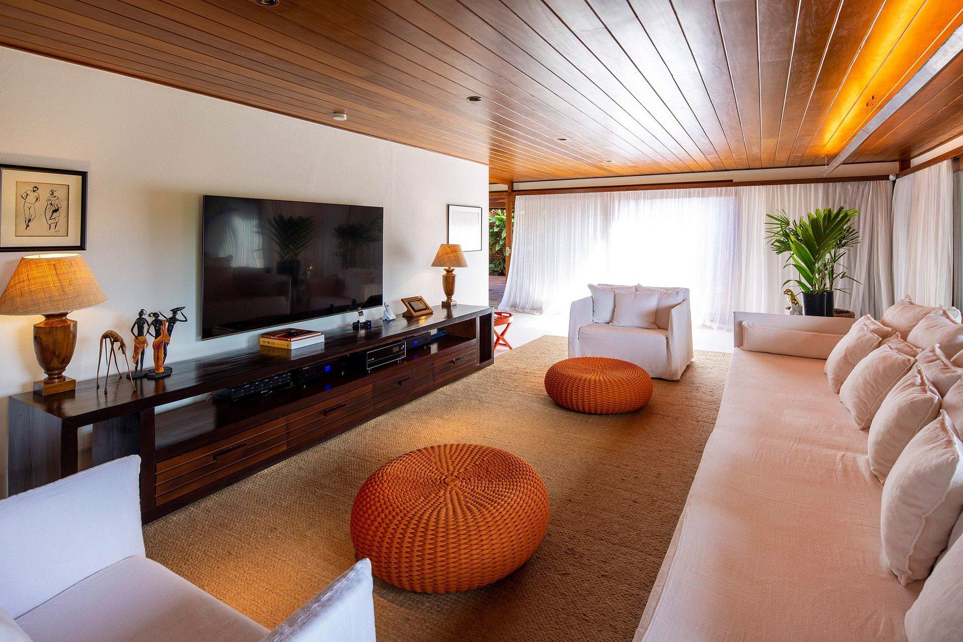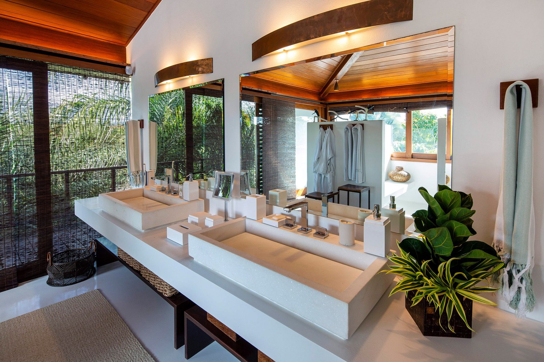 Projetado pelo arquiteto David Bastos, esta excelente casa tropical contemporânea é sustentada por preciosas estruturas de madeira e cercada por um luxuriante jardim tropical.