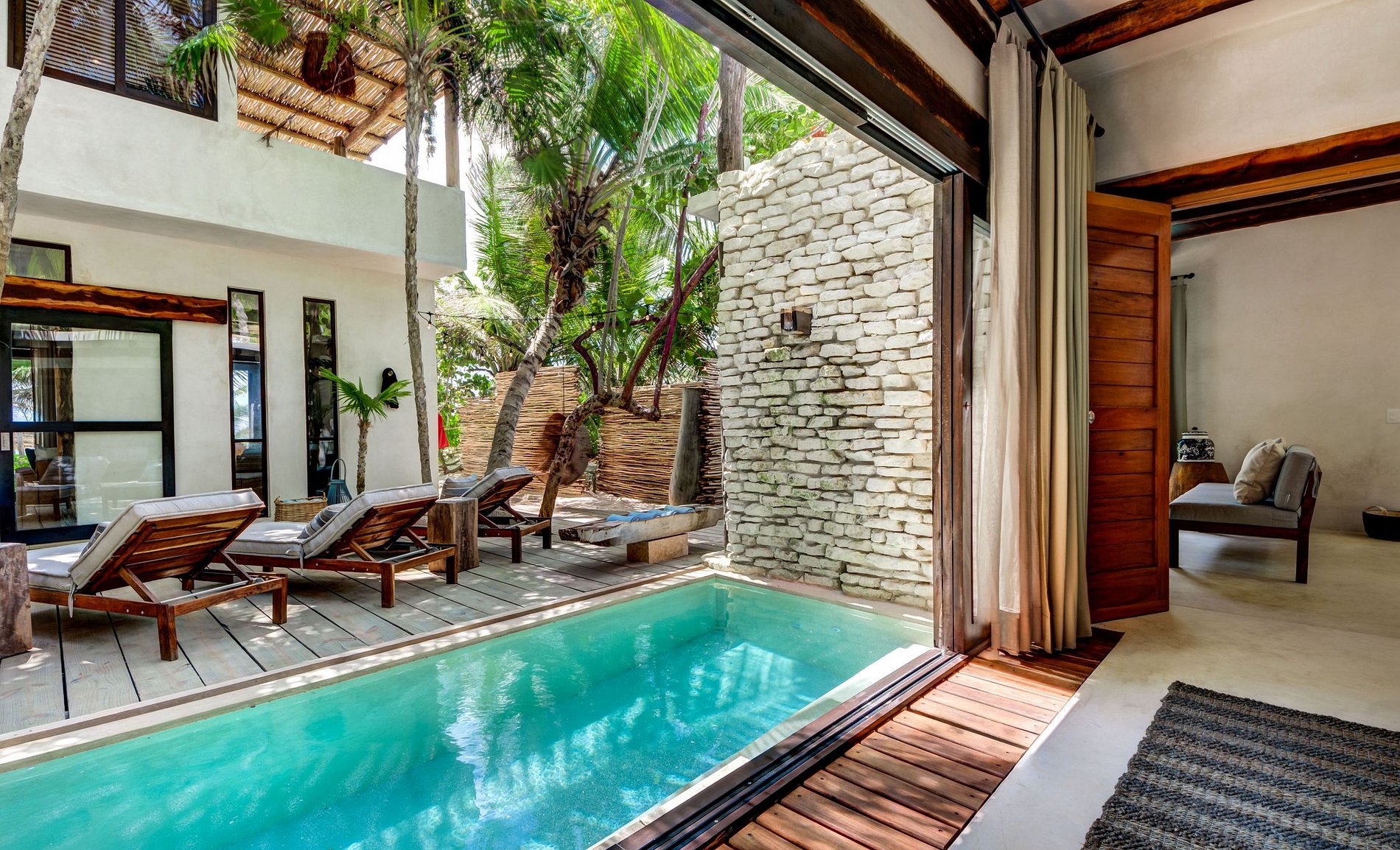 Esta casa possui uma bela casa principal com terraço privado em frente ao oceano e um telhado com uma enorme espreguiçadeira e vistas espetaculares do oceano e do pôr do sol na selva. Além disso, oferece uma casa com piscina, um bar ao ar livre e um pátio central privado com espreguiçadeiras ao lado de uma aconchegante piscina privada.