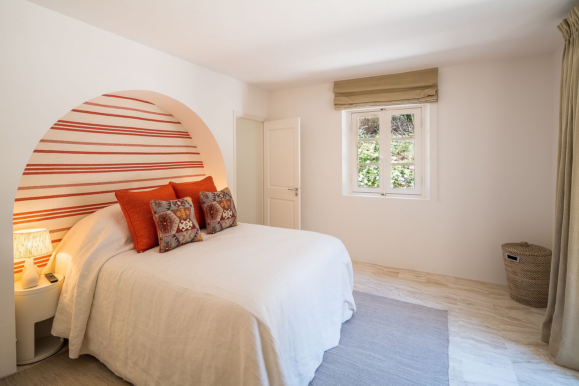 Quarto principal, cama de casal king size de 200 cm, amplo camarim, banheiro (chuveiro, pia dupla, banheira, WC), Smart TV, Apple TV e VOD, TV via satélite, sistema de som Sonos, cofre e acesso a um grande terraço privativo de 75 m² (área de estar ao ar livre), vista de 180° para oeste da piscina e do parque paisagístico.