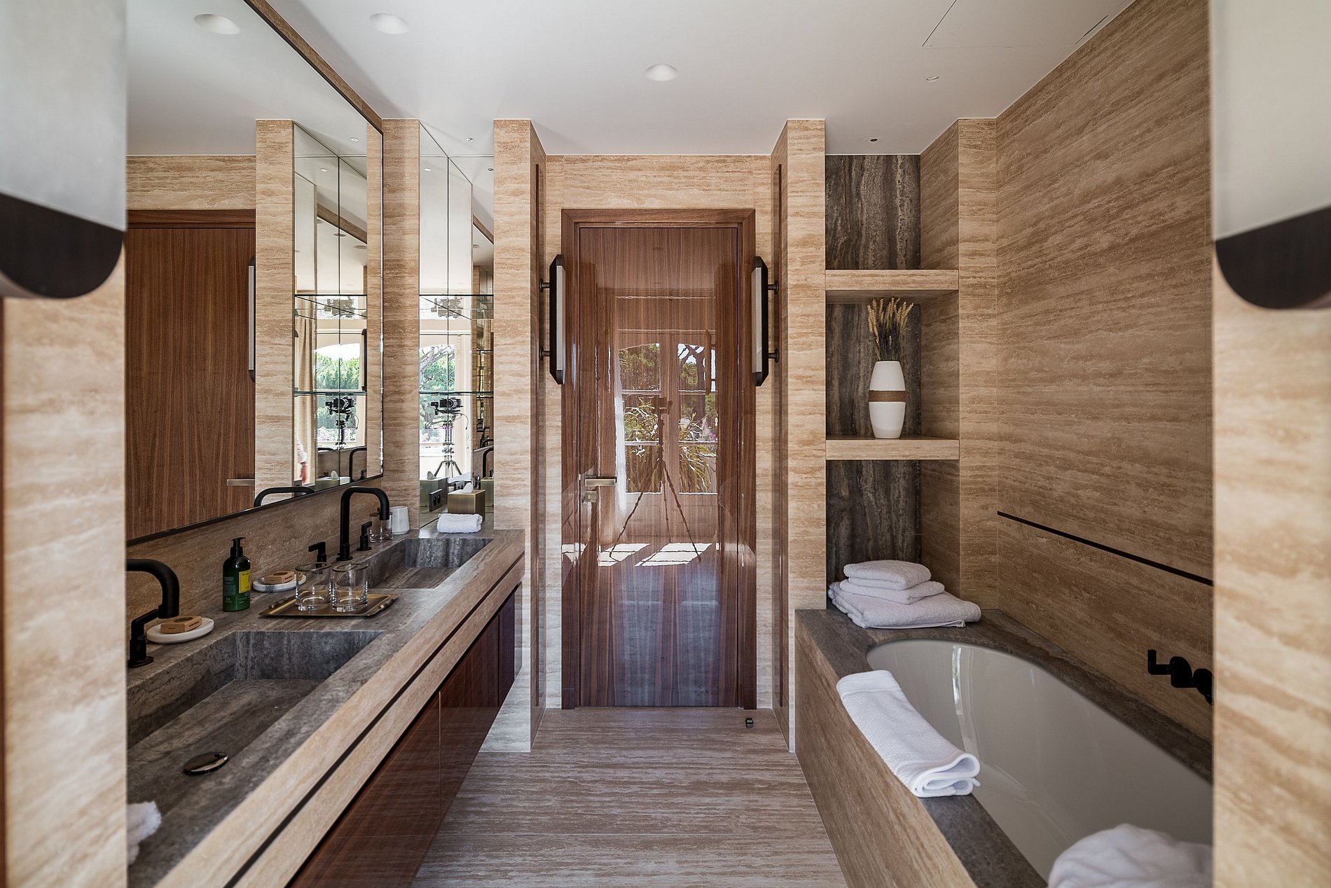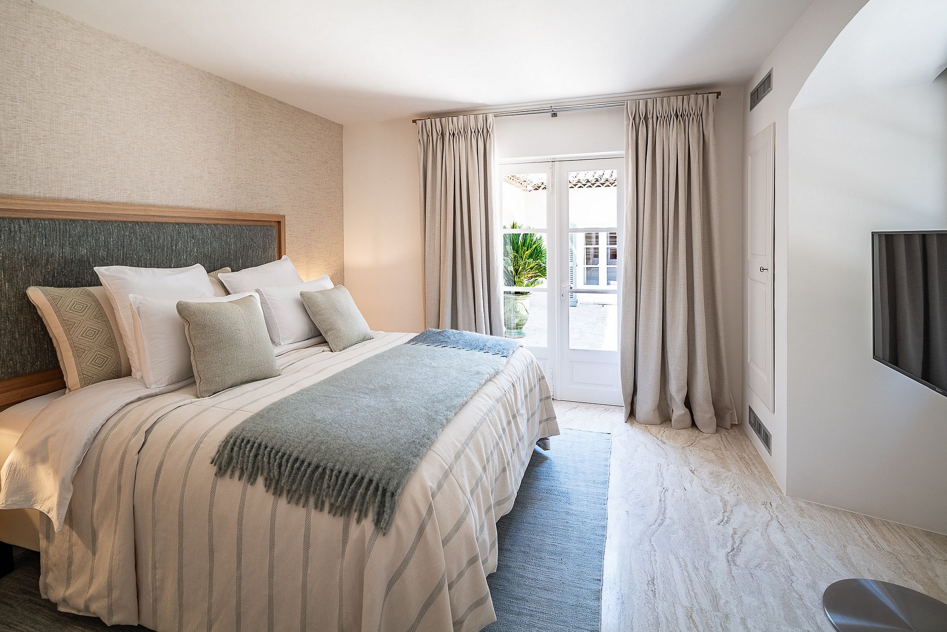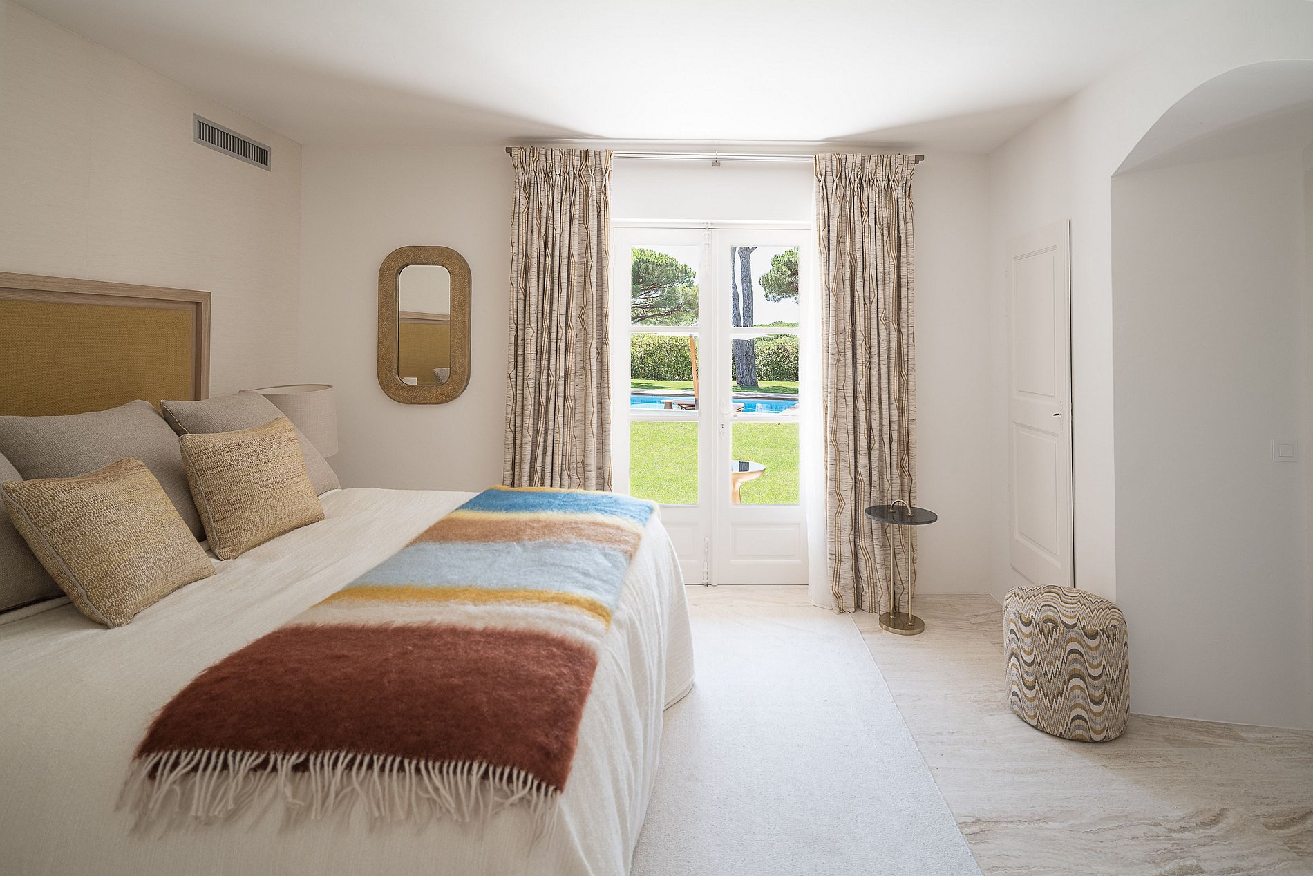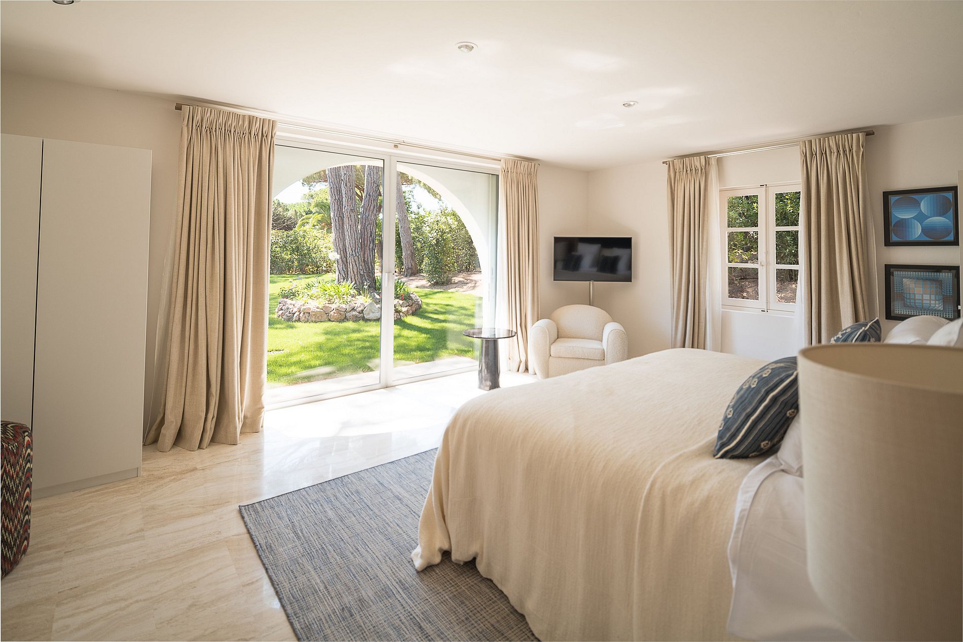 Quarto principal, cama de casal king size de 200 cm, amplo camarim, banheiro (chuveiro, pia dupla, banheira, WC), Smart TV, Apple TV e VOD, TV via satélite, sistema de som Sonos, cofre e acesso a um grande terraço privativo de 75 m² (área de estar ao ar livre), vista de 180° para oeste da piscina e do parque paisagístico.