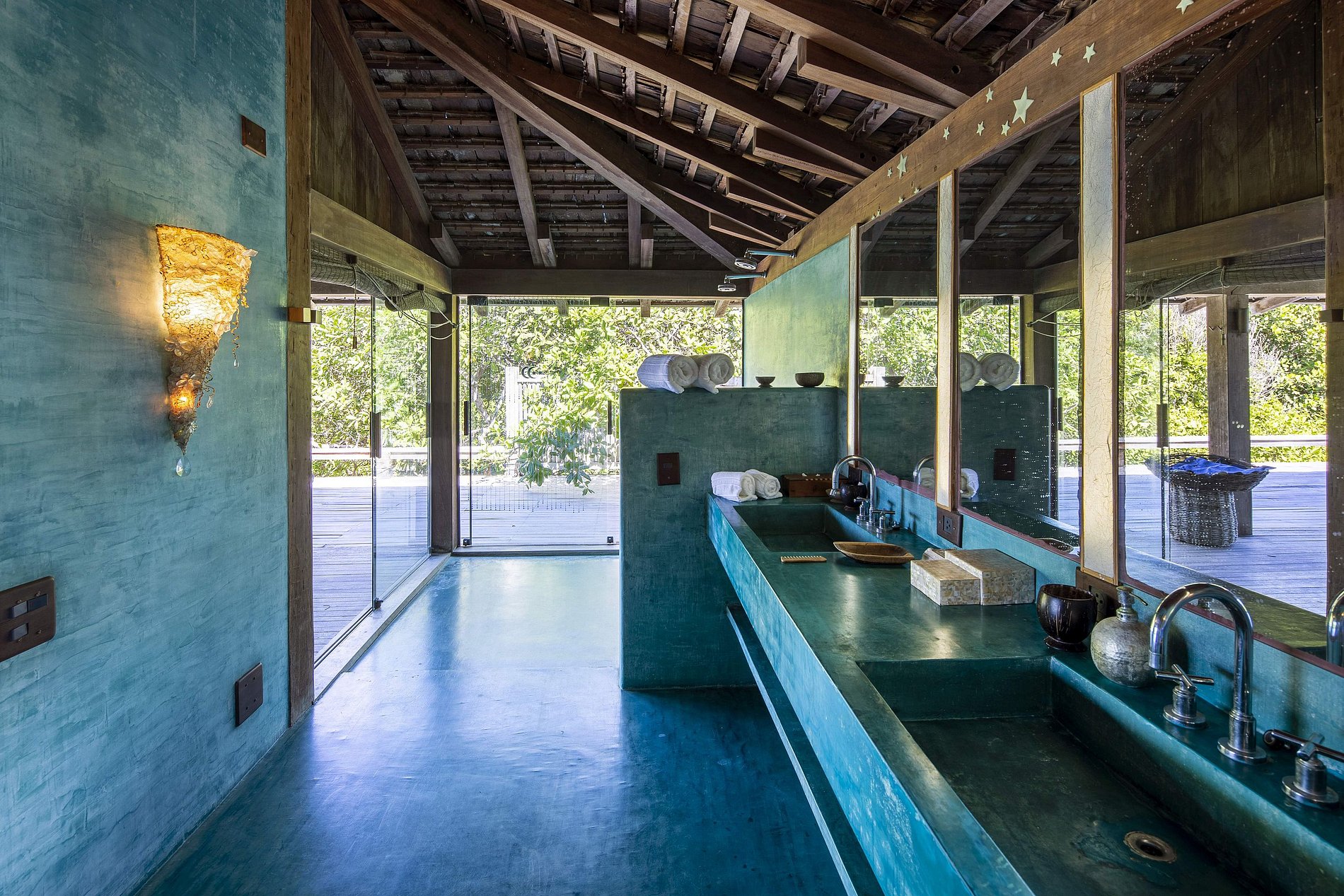 Suite Master: Cama King, mosqueteira, ar-condicionado, banheiro com pia dupla e ducha aberta no deck, walk-in closet, sofá, escritório, deck e varanda com área lounge de contemplação. Vista mar, piscina e jardim.