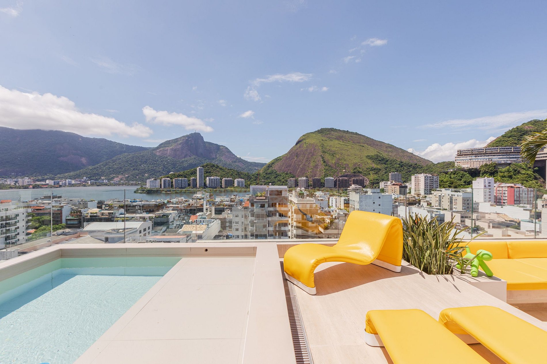 O andar de cima é onde você pode encontrar a suite principal (com Jacuzzi) e a área de terraço com uma linda piscina. Esse apartamento é uma opção excelente para quem quer visitar o Rio com conforto e desfrutando de lindas vistas.