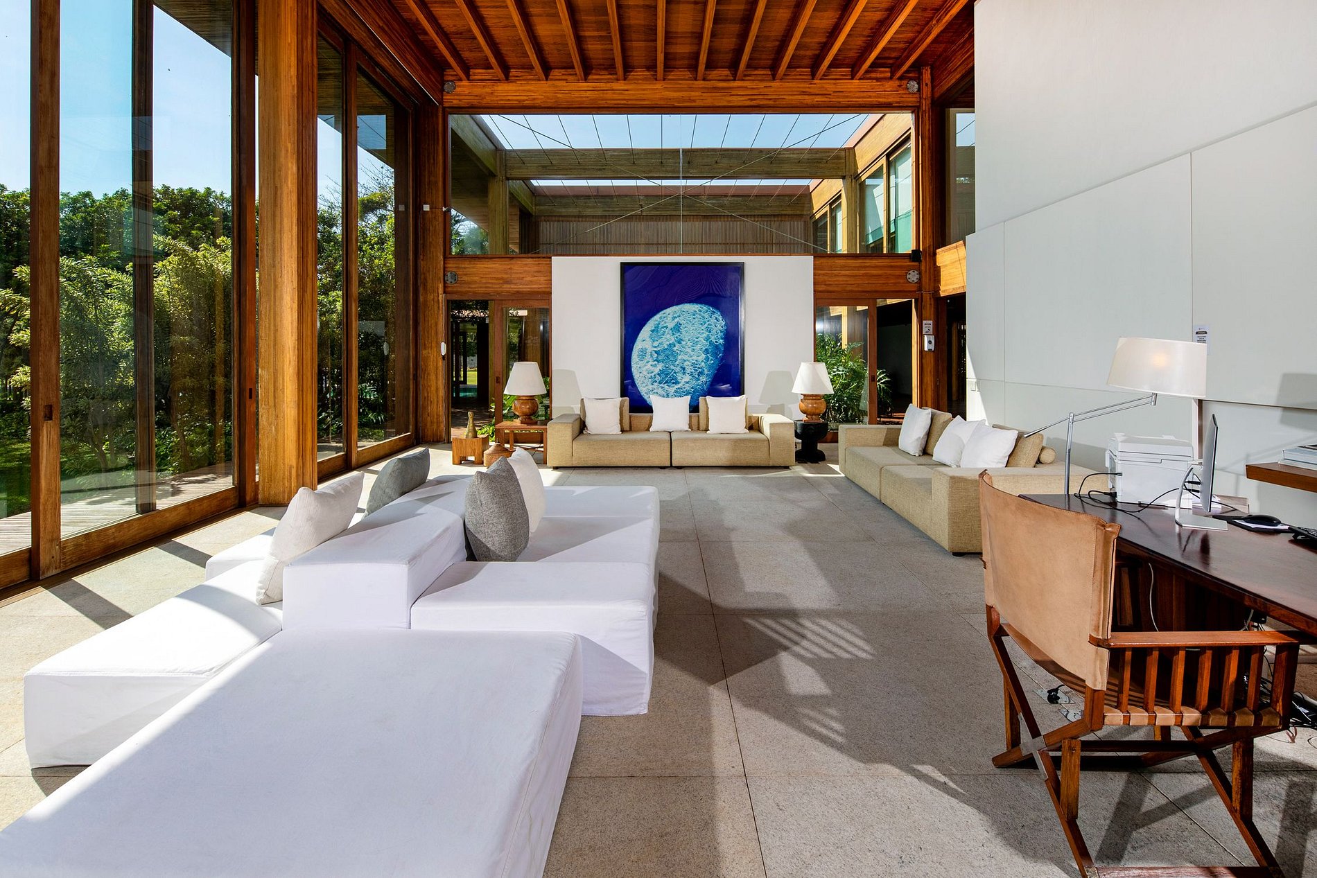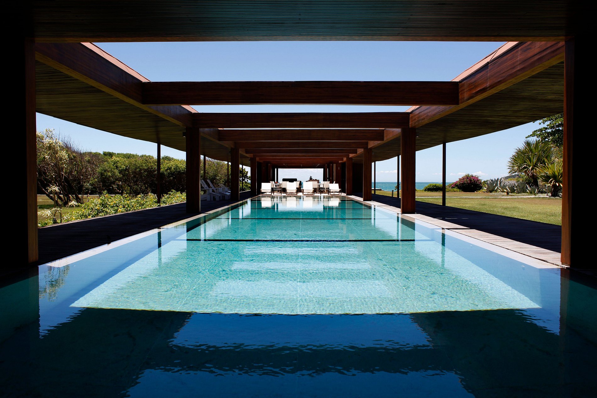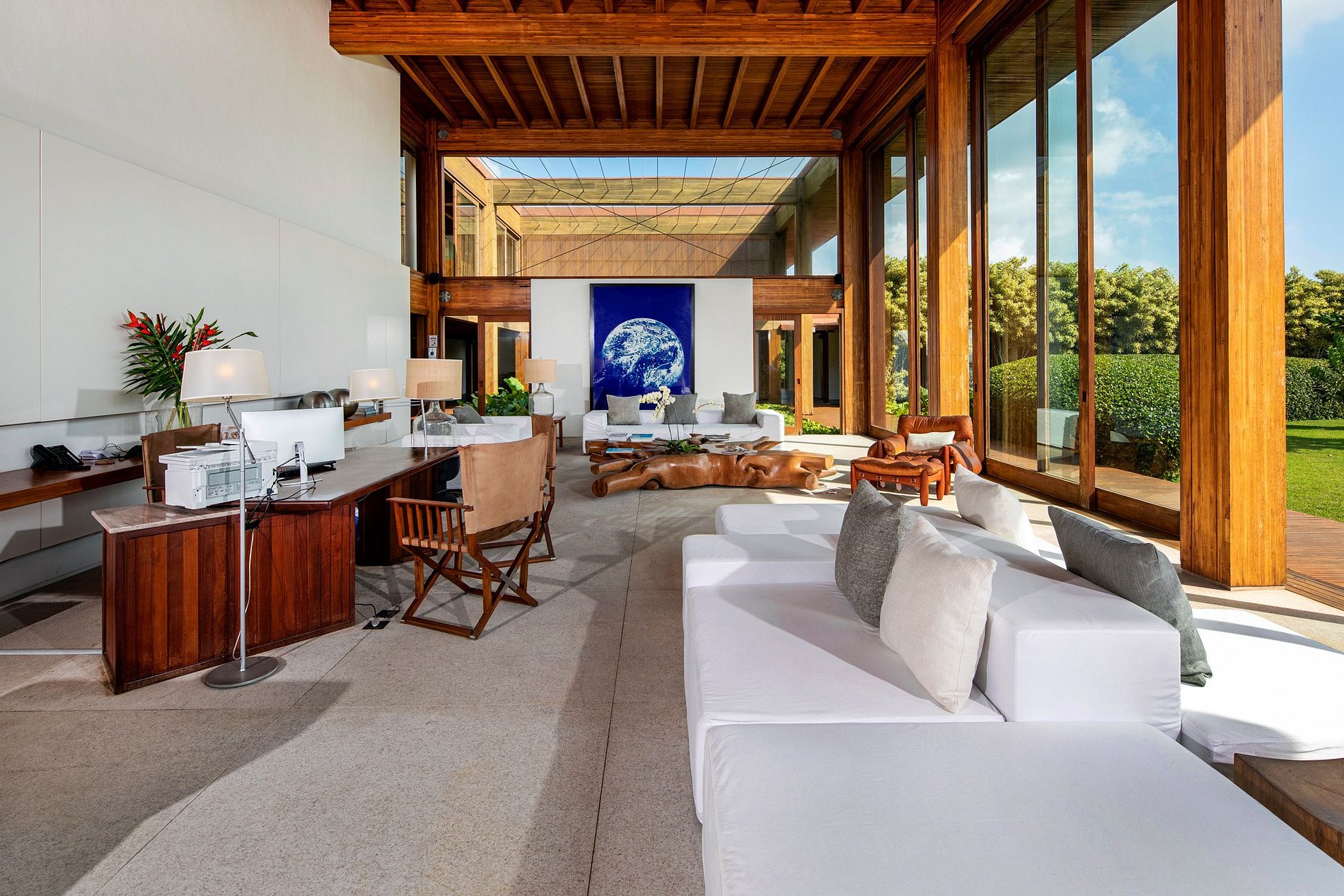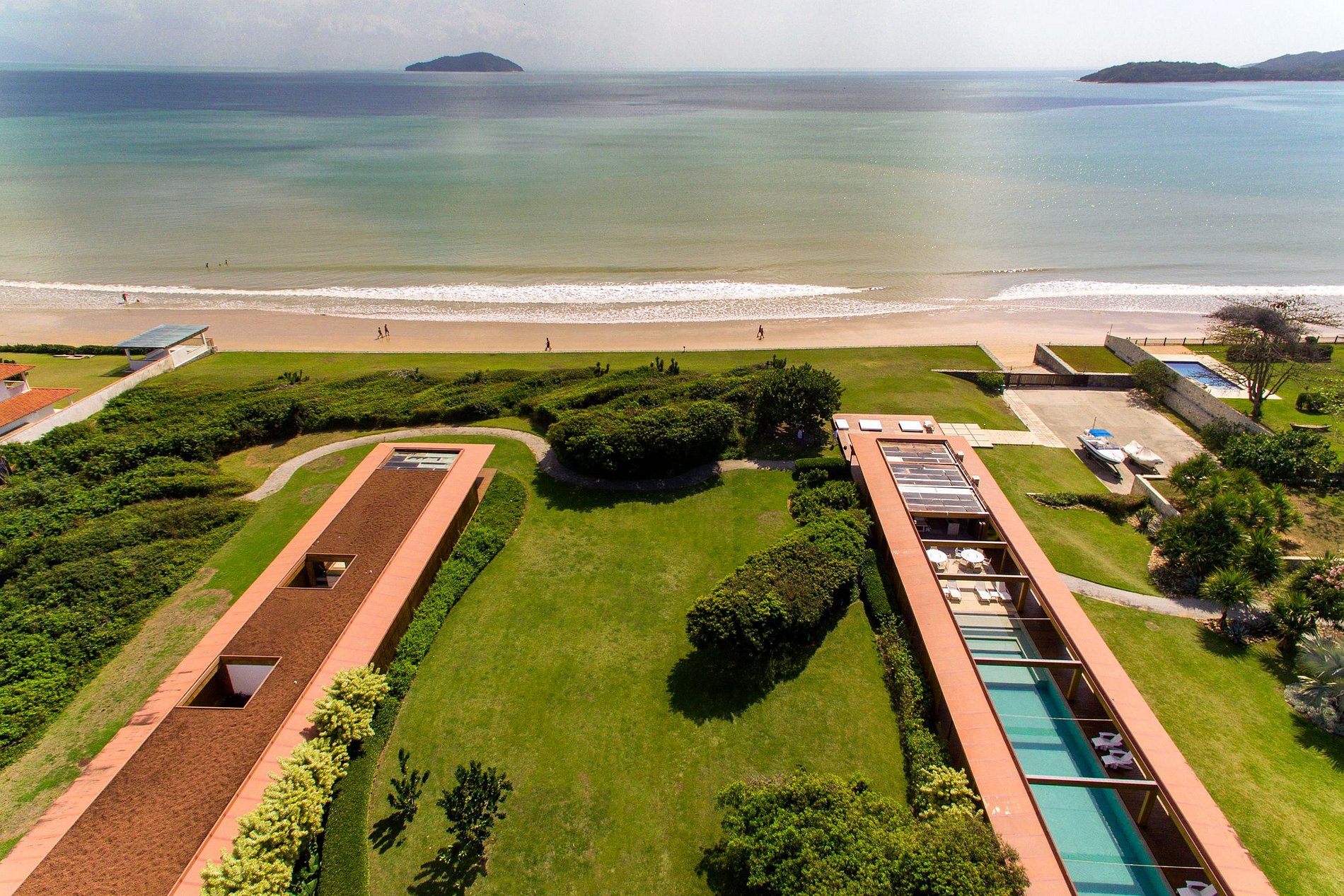 O design ecologicamente consciente foi magistralmente projetado para aproveitar ao máximo a luz do sol e a brisa do mar. A mansão consiste numa ala central que contém a sala de estar, as suítes máster e a área de serviço e é seccionada por duas alas adicionais, onde se localizam as demais suítes, o jardim, a piscina e muito mais. A estrutura forma um amplo “H” que confere a todas as áreas da mansão acesso à natureza ao redor. Até mesmo corredores foram concebidos de modo a privilegiar uma planta aberta, o que produz um efeito espetacular de iluminação e ventilação naturais em todos os 4.900 m² de área do imóvel.