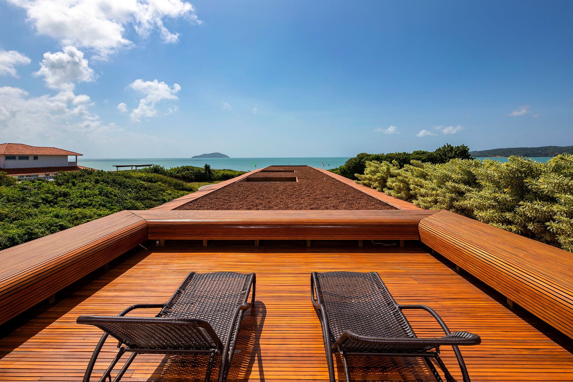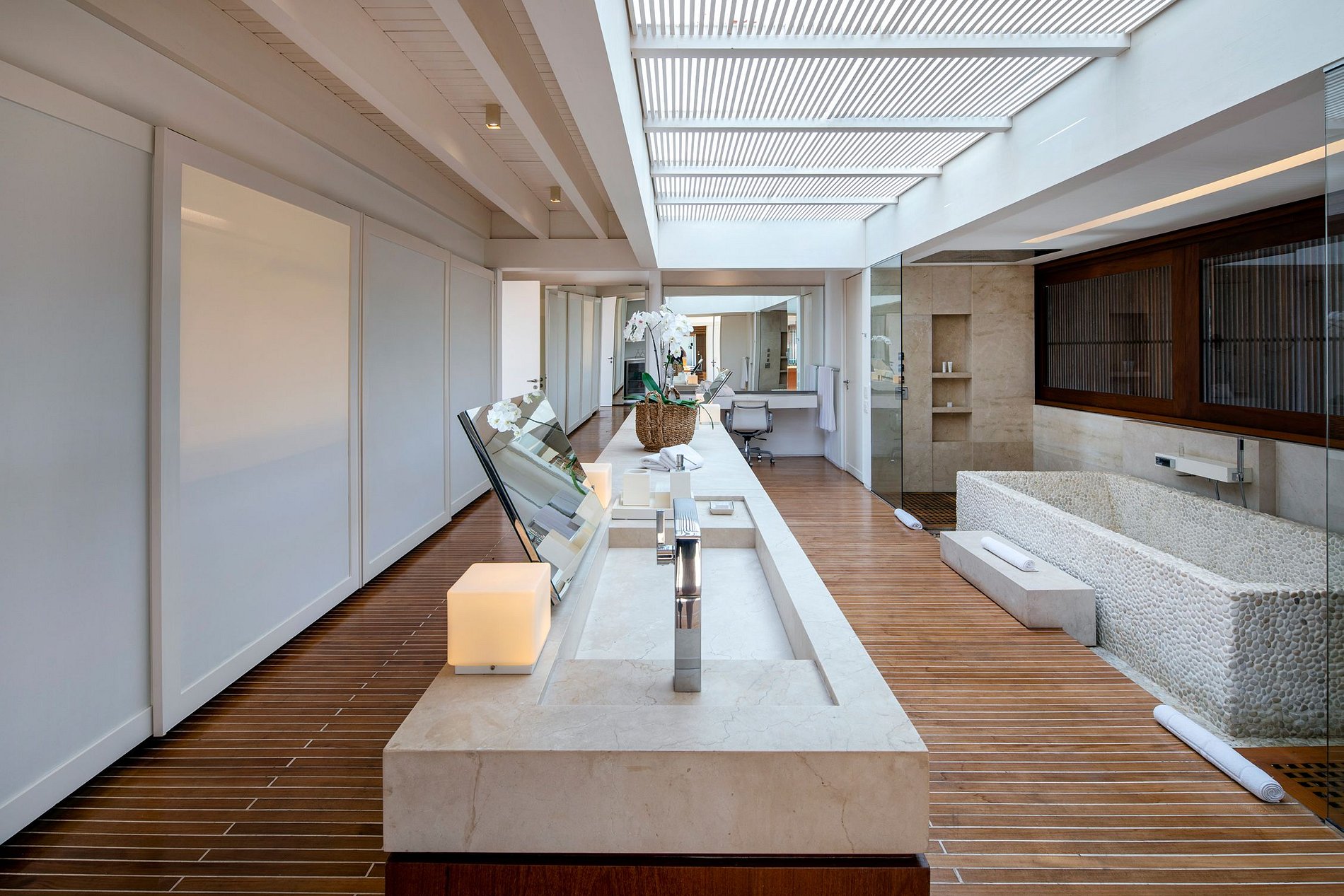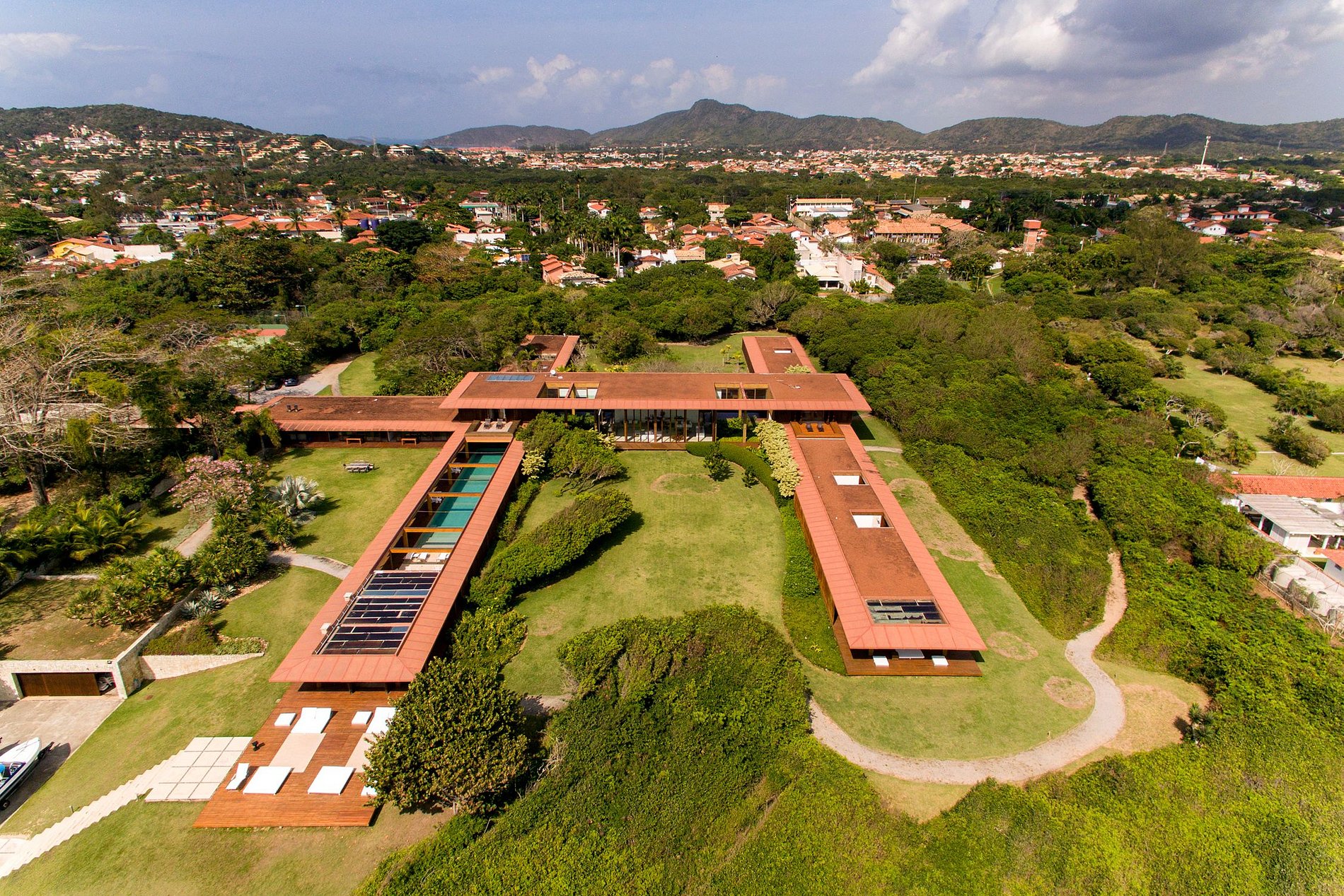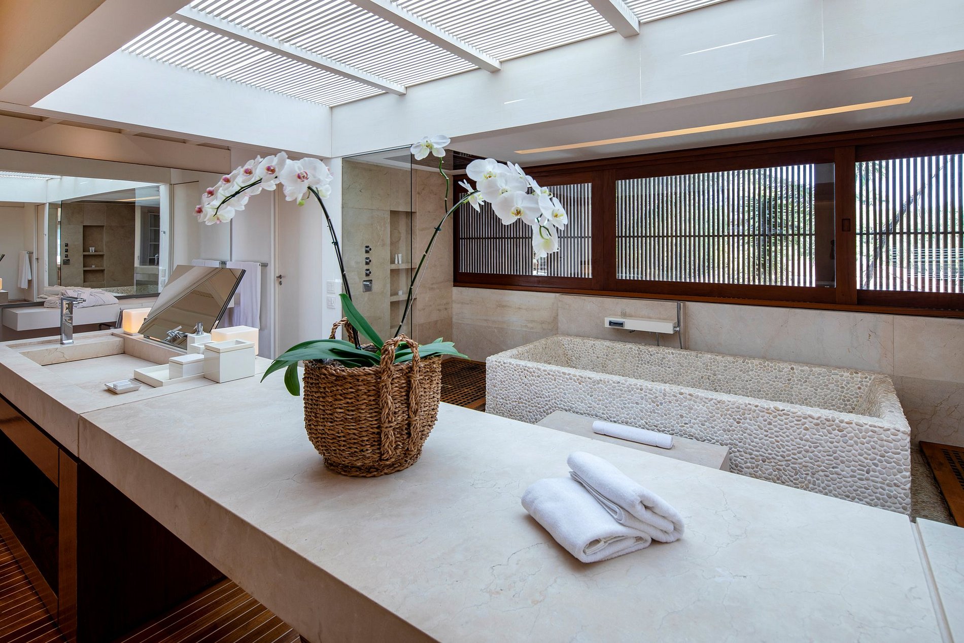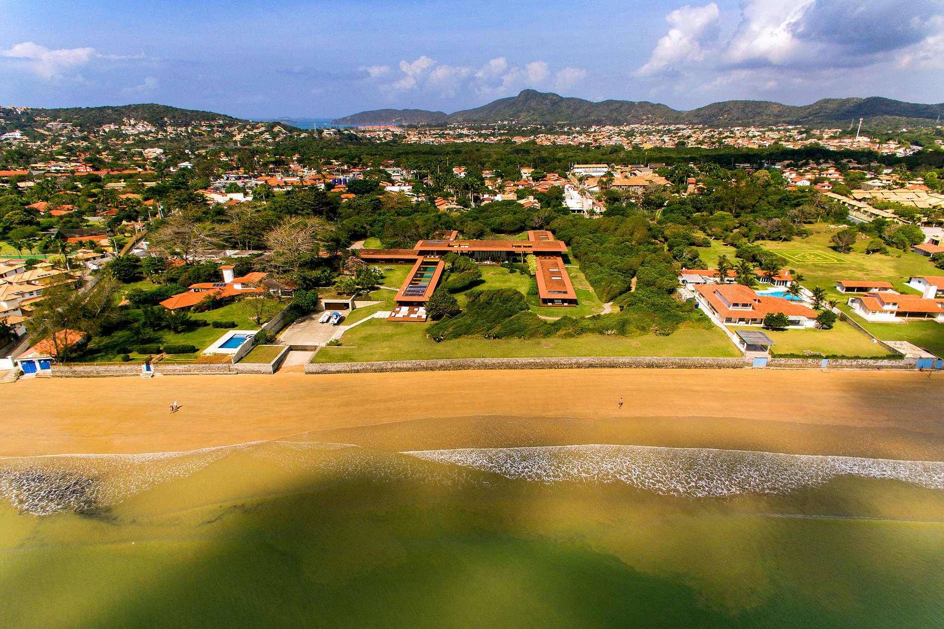 O design ecologicamente consciente foi magistralmente projetado para aproveitar ao máximo a luz do sol e a brisa do mar. A mansão consiste numa ala central que contém a sala de estar, as suítes máster e a área de serviço e é seccionada por duas alas adicionais, onde se localizam as demais suítes, o jardim, a piscina e muito mais. A estrutura forma um amplo “H” que confere a todas as áreas da mansão acesso à natureza ao redor. Até mesmo corredores foram concebidos de modo a privilegiar uma planta aberta, o que produz um efeito espetacular de iluminação e ventilação naturais em todos os 4.900 m² de área do imóvel.