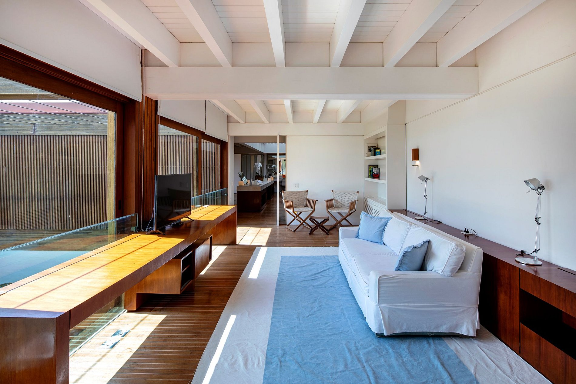 Ao descer das suítes, você chegará à espaçosa, opulentamente iluminada e impecavelmente decorada sala de estar, que dispõe de amplo espaço para acomodar todos os hóspedes e pode ainda receber confortavelmente grandes grupos de convidados. Com pé direito alto e janelas imensas que cobrem paredes inteiras, o espaço é inundado por luz e energias positivas, que criam o ambiente perfeito para uma socialização despreocupada.