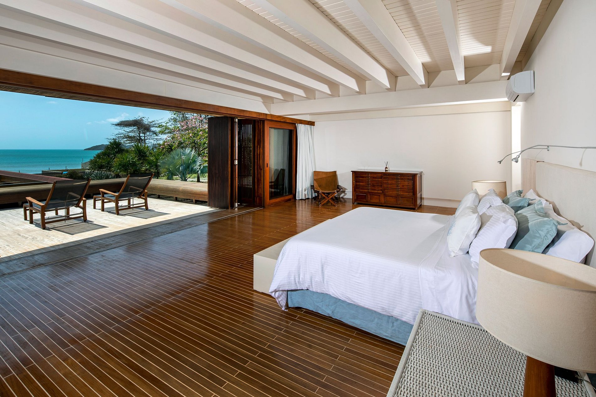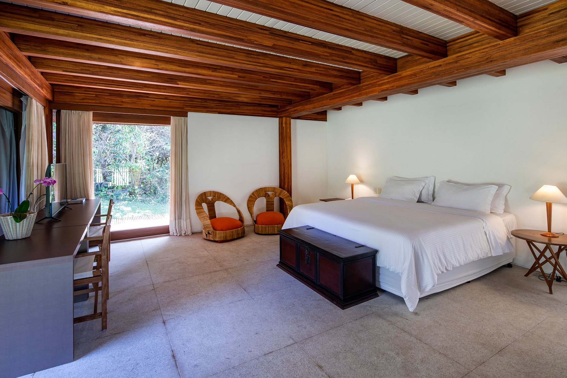As duas suítes máster são separadamente situadas no segundo piso e possuem doses generosas de privacidade. Cada uma delas possui sua própria sala de estar, closet e varanda que se abre para o restante do terreno. Ambas foram luxuosamente dotadas com as camas mais confortáveis do mercado, bem como decoradas com a mobília cuidadosamente selecionada, de forma a mantera estética natural que caracteriza todo o imóvel.