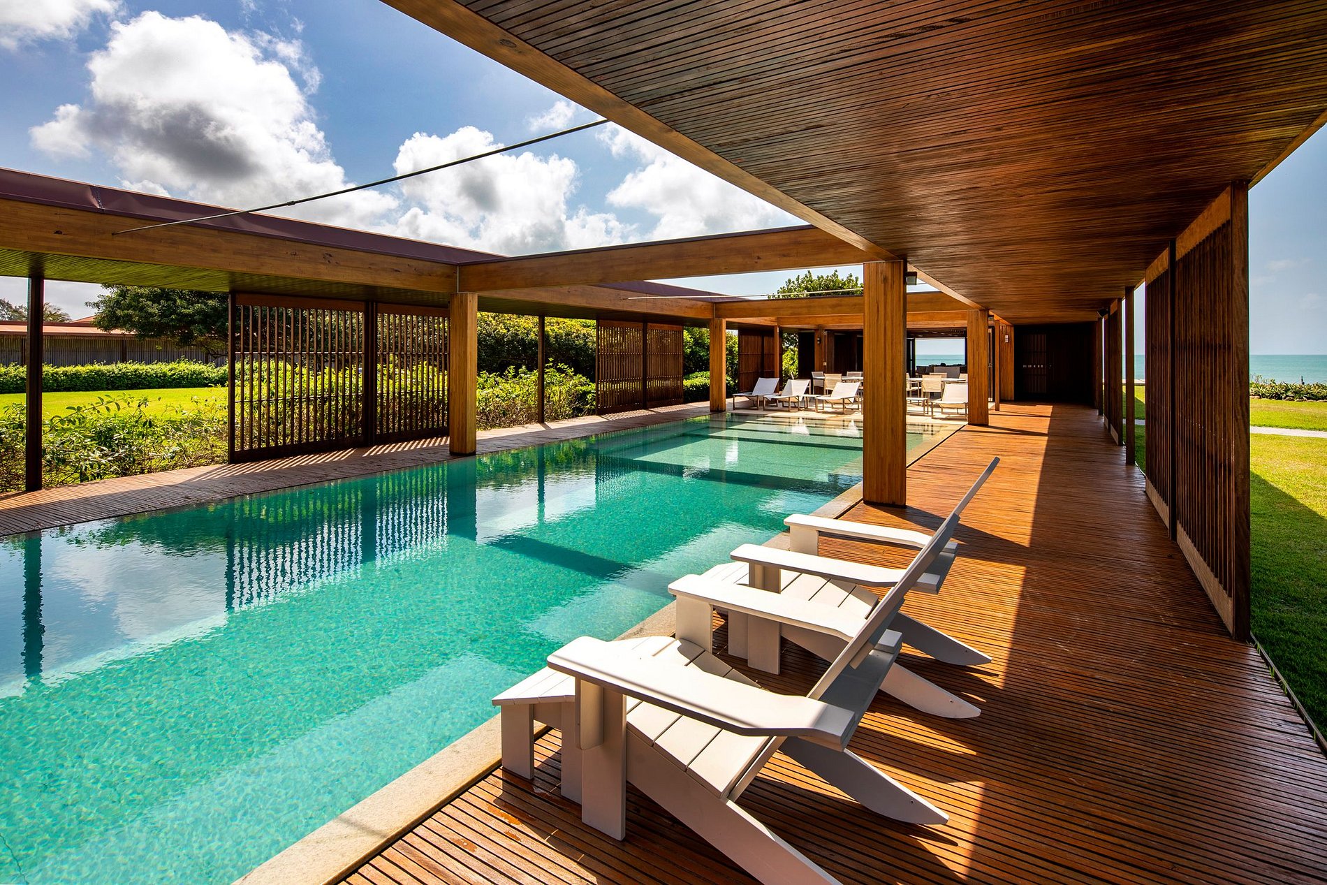 O uso elegante de madeira laminada com origem certificada como o principal material da construção contribui para que a mansão se integre sem esforço à natureza ao redor. Contando com amplas janelas e espaçosas aberturas para os demais cômodos onde possível, o design da casa proporciona uma sensação de abertura e integração com os 39.000m2 do terreno. Os jardins, construídos em torno da suíte, mas ainda assim dentro da estrutura principal da casa, conferem um toque natural ao imóvel. Já a incrível piscina indoor-outdoor, equipada com sua própria cozinha gourmet, completa o projeto criativo com a sofisticação esperada.