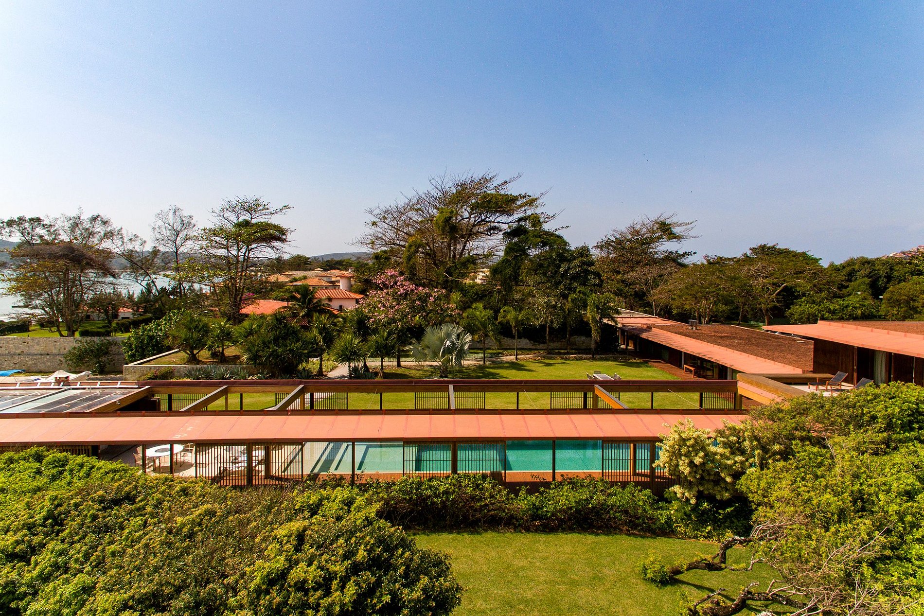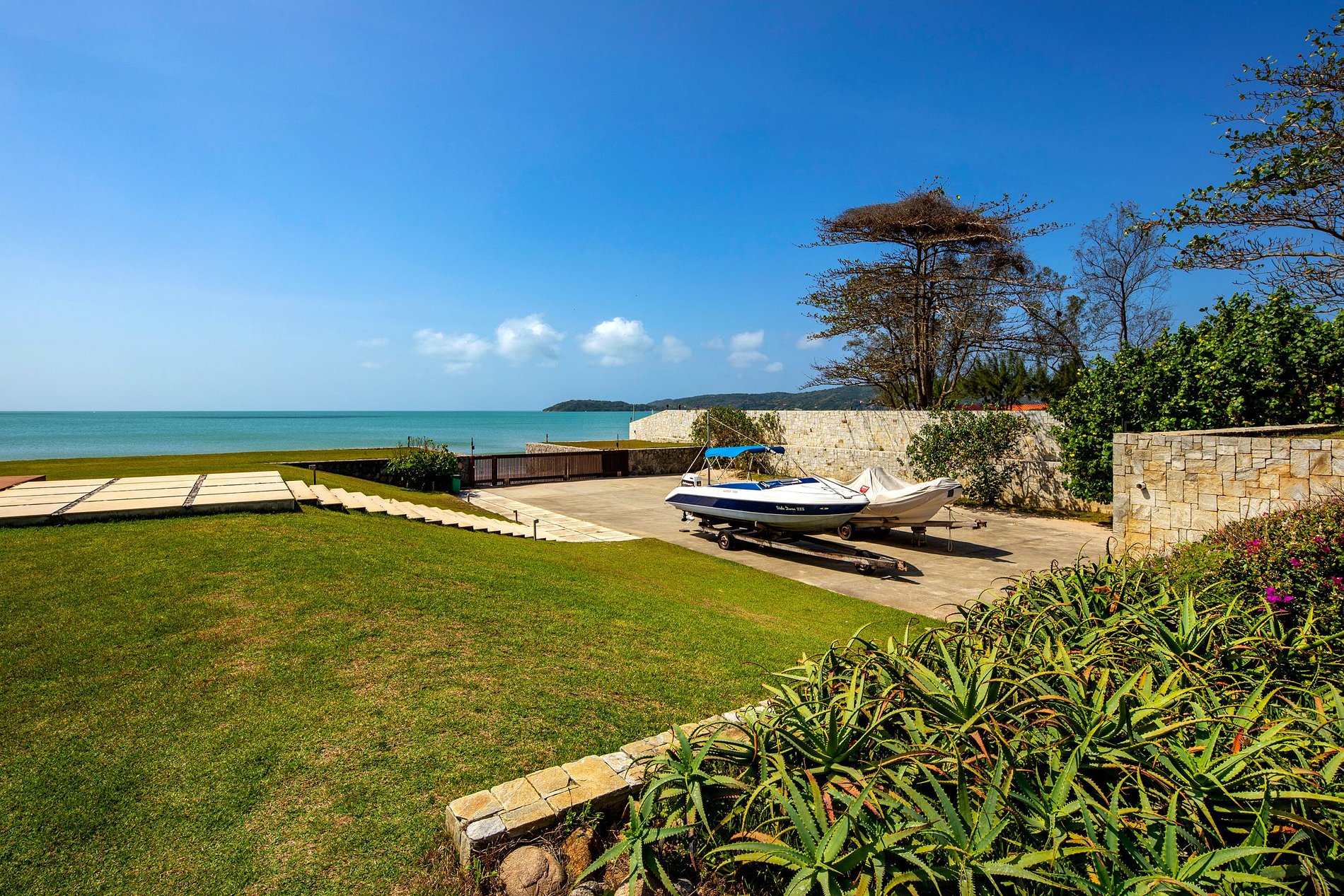 O terreno conta ainda com quadra de tênia, garagem para carros e garagem para barcos à sua disposição. Os 39.000m2 que compõem o terreno são repletos de fauna e flora locais, proporcionando a você contato direto com as belezas naturais de Búzios. Localizada bem ao lado da praia, a casa está a uma caminhada breve de distância do mar, mas a disposição do terreno e o projeto arquitetônico da mansão garantem alta privacidade e baixa visibilidade externa.
