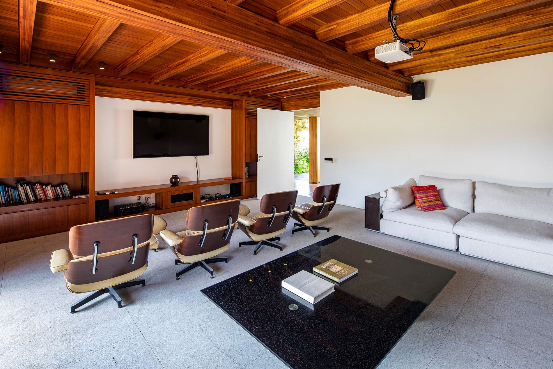 Em direção à ala traseira, você vai encontrar 8 igualmente bem mobiliadas suítes com acesso direto ao jardim do terreno. Cada quarto possui um estilo único e se integra de forma peculiar com a casa e o ambiente externo; todos oferecem aos hóspedes o que há de mais suntuoso em termos de acomodações de luxo. A área das suítes é dividida ao meio pela sala de cinema especial, um cinema em miniatura perfeitamente equipado no conforto da sua casa.
