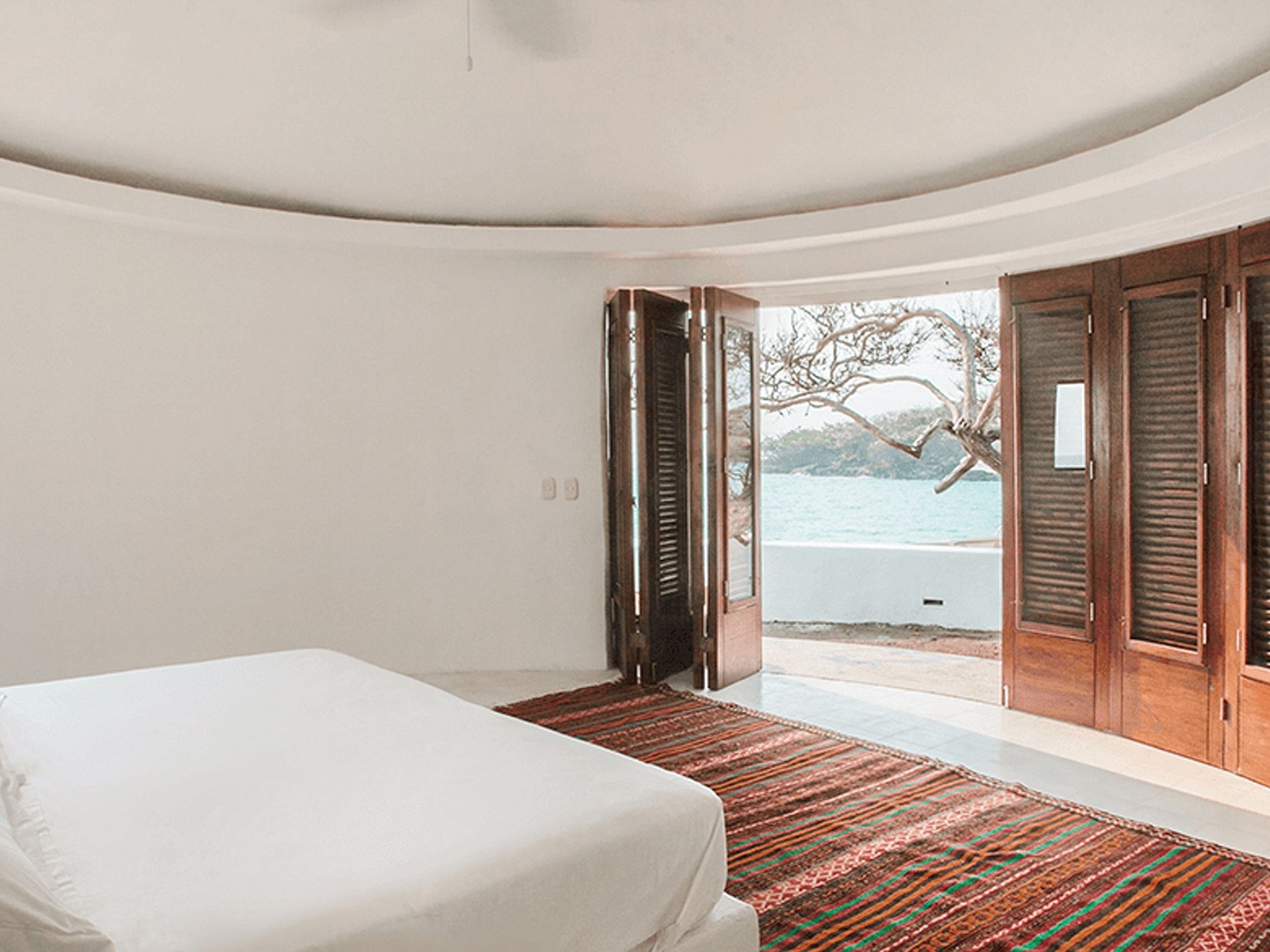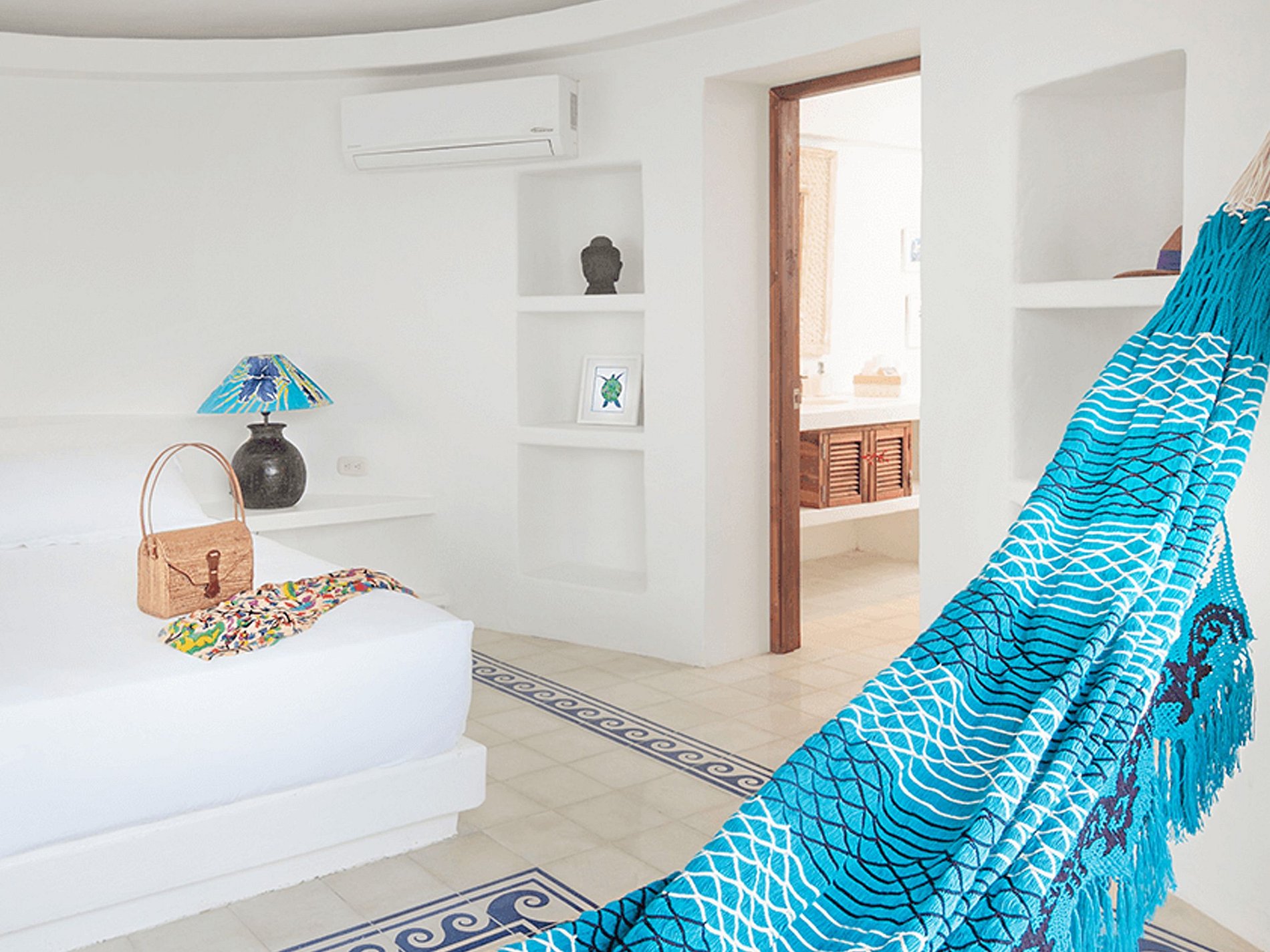 Três salas cheias de beleza e conforto, com banheiro privativo, redes, TV a cabo e ar condicionado, com capacidade para 6 pessoas, todas com vista para o mar.
