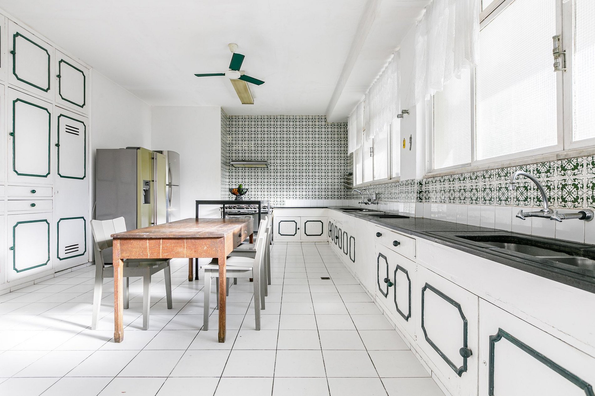 O jardim de inverno tem vista para a para a piscina, que por sua vez é cercada por palmeiras altas e árvores frutíferas exóticas, cheias de cores tropicais.