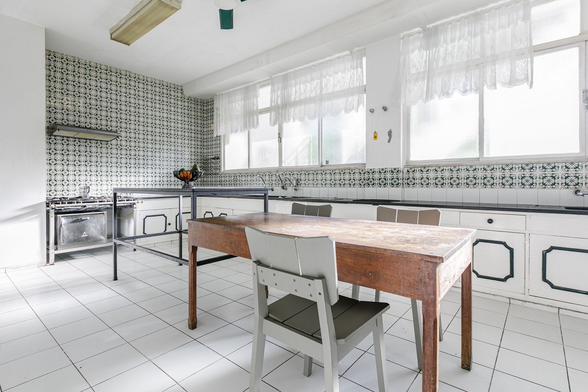 O jardim de inverno tem vista para a para a piscina, que por sua vez é cercada por palmeiras altas e árvores frutíferas exóticas, cheias de cores tropicais.