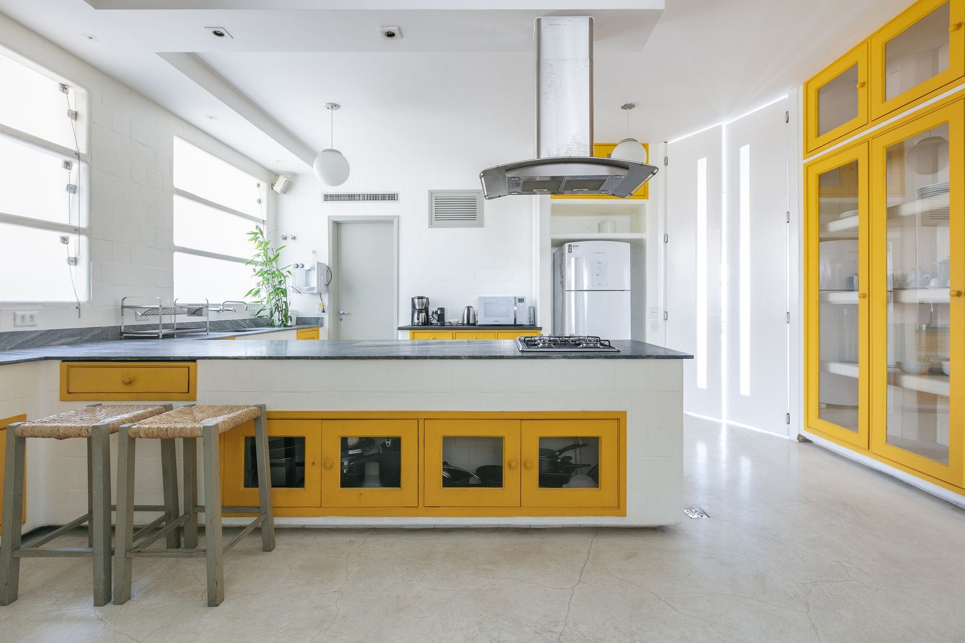 A elegante e linda cozinha tem uma decoração baseada em armários em madeira e bancadas de mármore escuro. Ela foi projetada com muito espaço para preparar grandes refeições e seus dois fogões, vários utensílios e eletroportáteis dão conta do recado com folga.