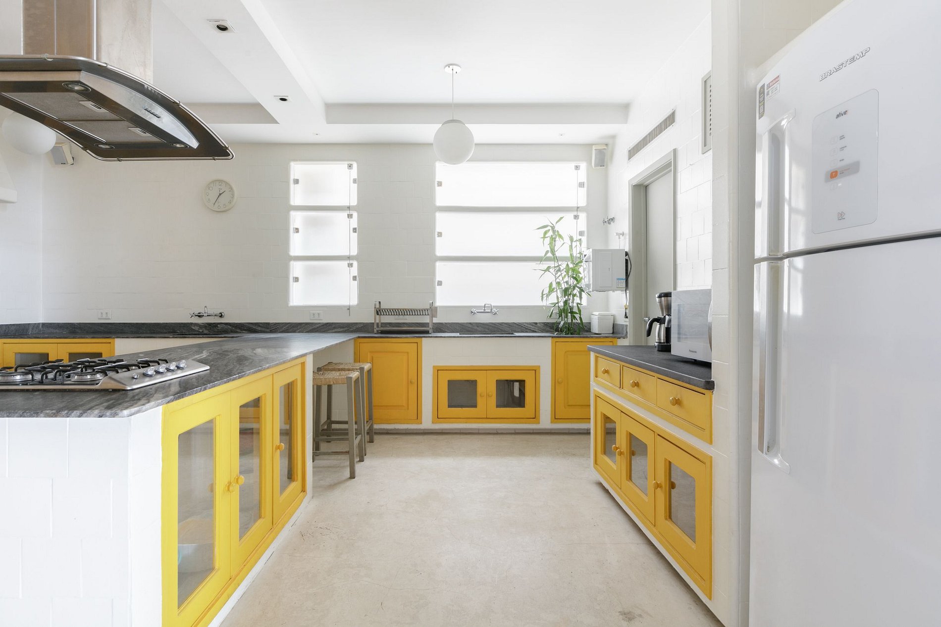 A elegante e linda cozinha tem uma decoração baseada em armários em madeira e bancadas de mármore escuro. Ela foi projetada com muito espaço para preparar grandes refeições e seus dois fogões, vários utensílios e eletroportáteis dão conta do recado com folga.