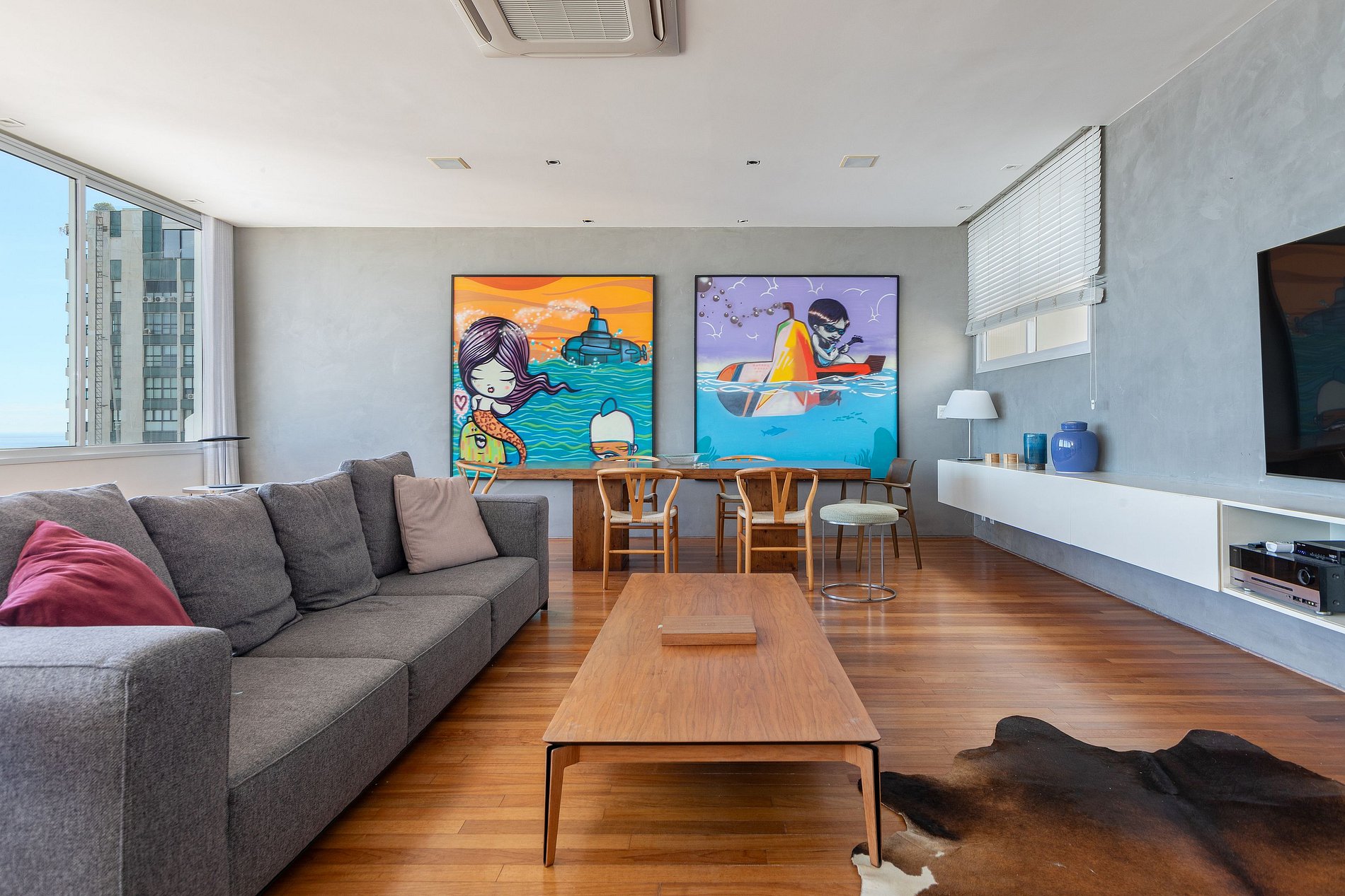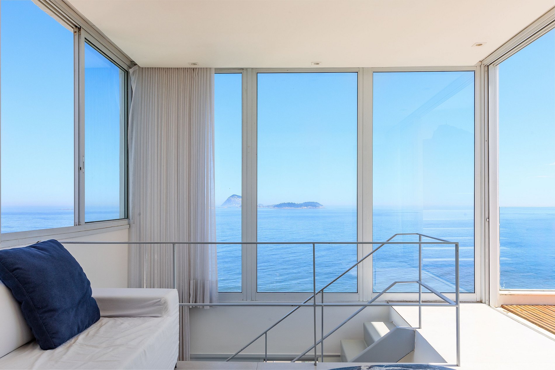 No segundo andar uma ampla sala indevassada com dois ambientes e com janelas que vão do chão ao teto, permitem uma vista direta e espetacular para a praia de Ipanema.