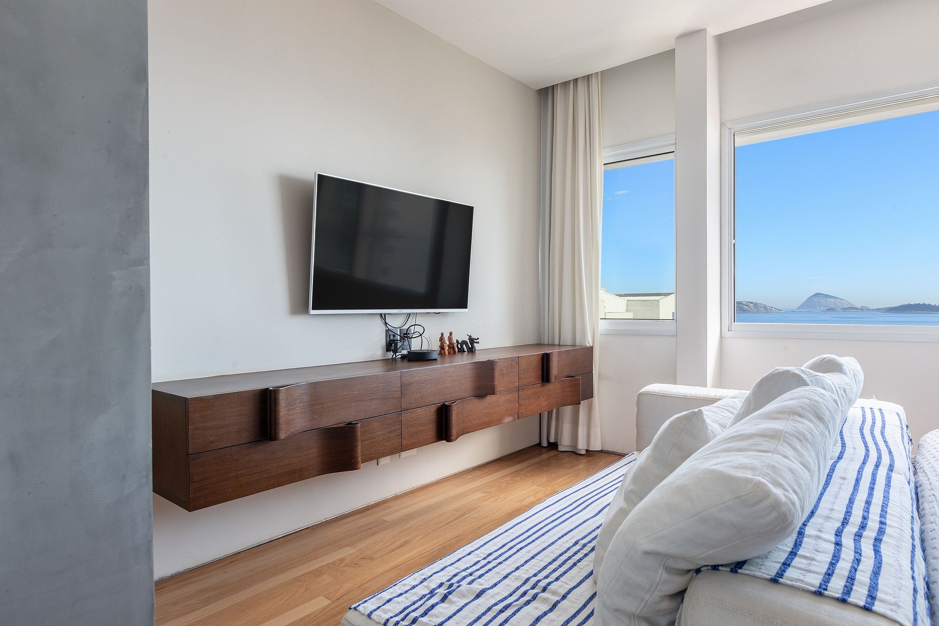 No primeiro andar você encontrará uma moderna cozinha no estilo gourmet e 3 quartos suítes, duas de frente para o mar e a terceira, nos fundos, com uma varanda com uma vista fantástica do Cristo Redentor.