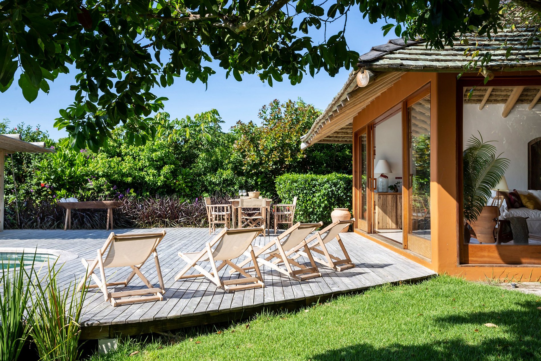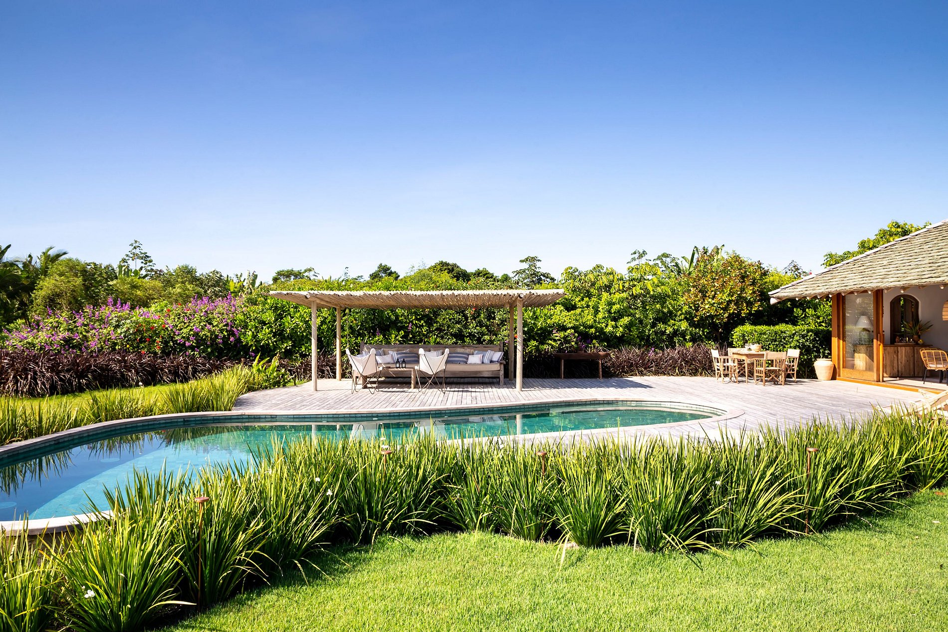 Casa com ambientes integrados mobília nova, oferecendo convívio confortável e estar maravilhoso. A piscina com formato orgânico em um deck de madeira, pergolado, gramado e vista mar como plano de fundo. Cozinha bem equipada com fogão em ilha, disponibilizando experiências para chefes amadores ou profissionais.