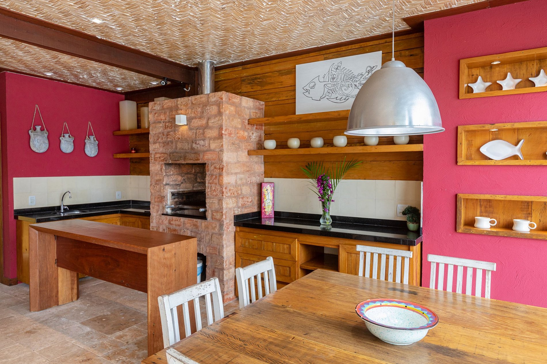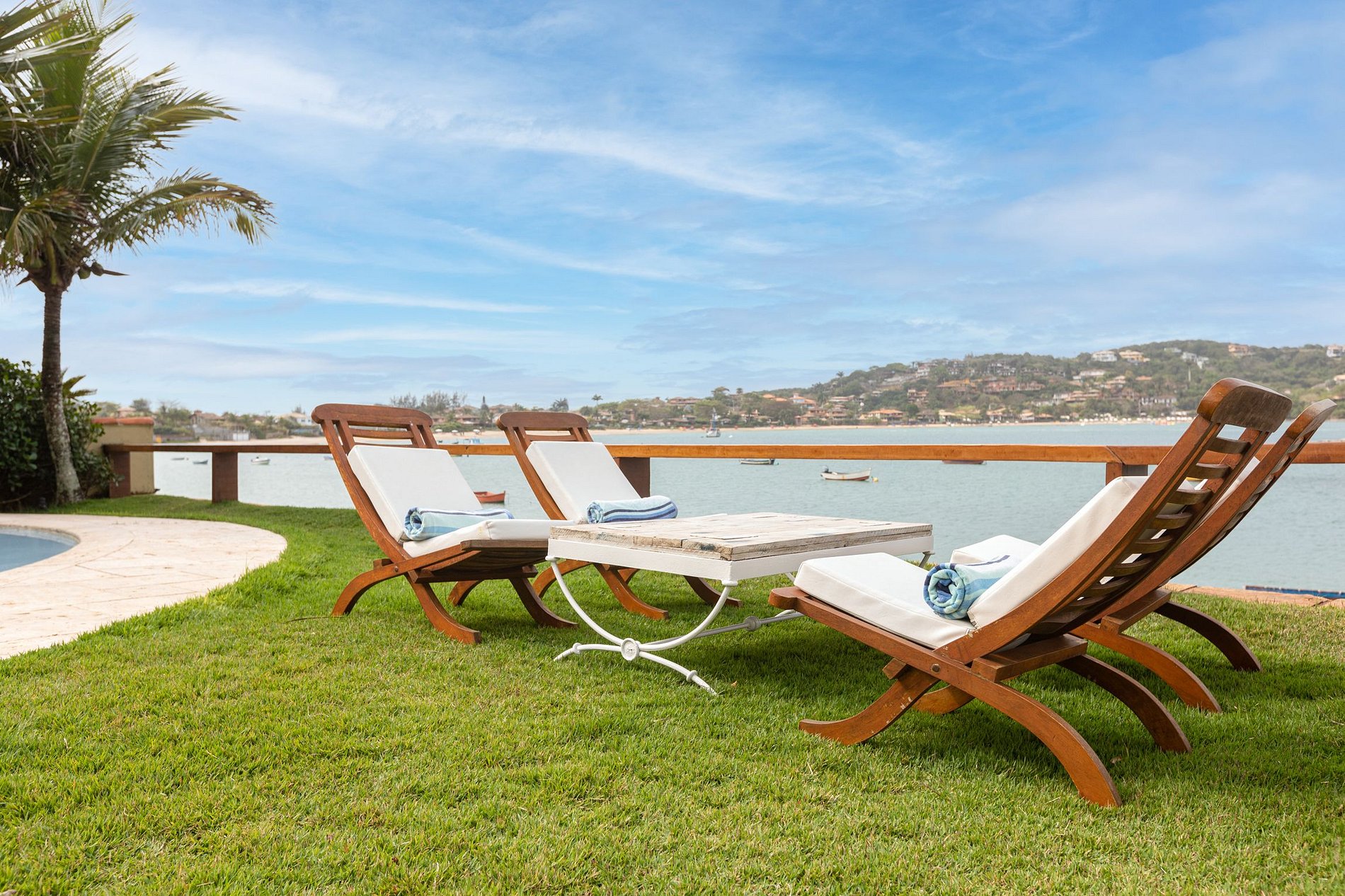 Uma das salas comuns abre-se completamente para se juntar ao espectacular paraíso da área exterior desta propriedade. Esta área ao ar livre é decorada com espreguiçadeiras, redes e luxuosas mesas ao ar livre com toldo. Á área de churrasco é coberta e fantástica, possuí uma churrasqueira a carvão, geladeira, máquina de gelo e uma grande mesa para refeições. No entanto, o destaque é a grande piscina com uma vista super panorâmica para a Baía da Ferradura. Para os clientes que buscam a melhor hospedagem, este é um lugar incrível para relaxar e desfrutar o clima tranquilo e o belo ambiente de Búzios.