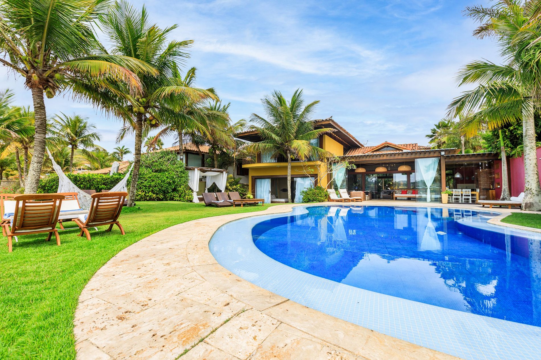 Uma das salas comuns abre-se completamente para se juntar ao espectacular paraíso da área exterior desta propriedade. Esta área ao ar livre é decorada com espreguiçadeiras, redes e luxuosas mesas ao ar livre com toldo. Á área de churrasco é coberta e fantástica, possuí uma churrasqueira a carvão, geladeira, máquina de gelo e uma grande mesa para refeições. No entanto, o destaque é a grande piscina com uma vista super panorâmica para a Baía da Ferradura. Para os clientes que buscam a melhor hospedagem, este é um lugar incrível para relaxar e desfrutar o clima tranquilo e o belo ambiente de Búzios.