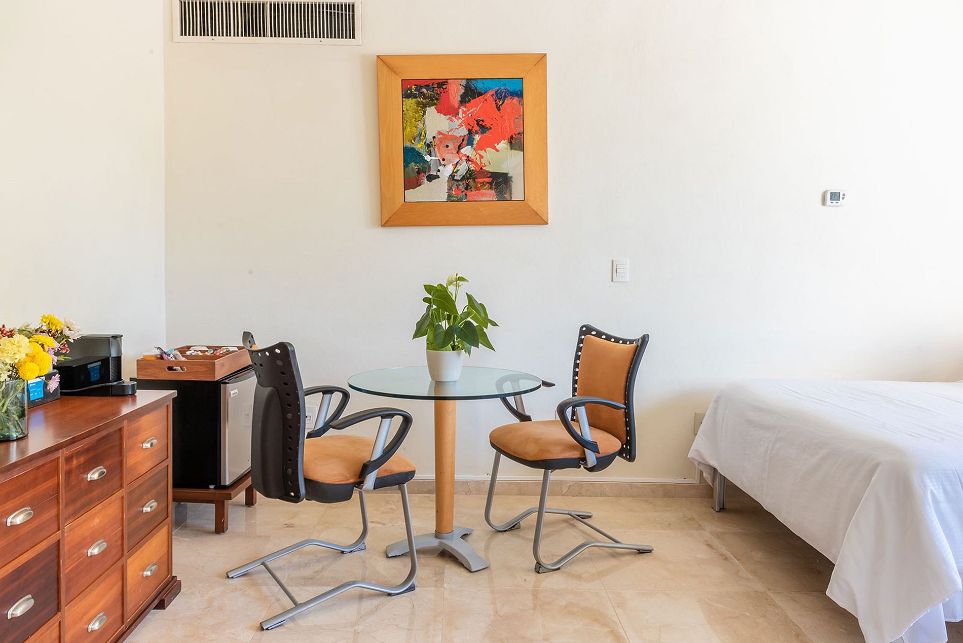 Futon, cama king size, ar condicionado, ventilador de teto, banheiro privativo com banheira e chuveiro, secador de cabelo, caixa de segurança, TV inteligente, produtos de higiene pessoal, acesso wifi.